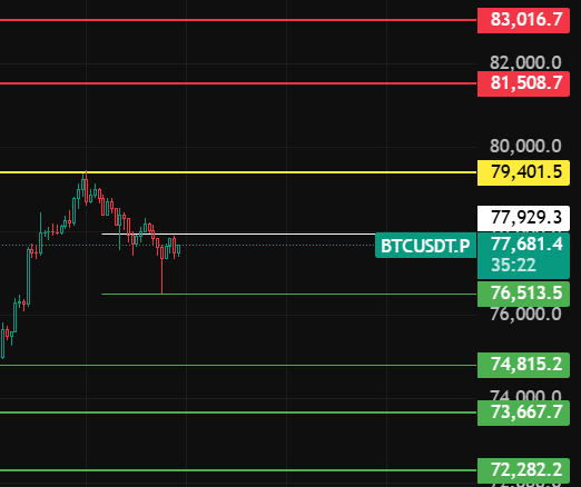BTC夜间留意77900这个位置,只有4小时级别收在此位置上方这波回调才算结束,行情往上上方去79400-81500-83000这几个位置附近等空单!