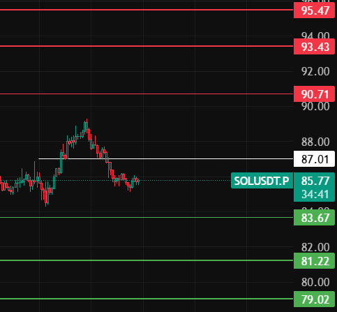 SOL夜间留意87这个位置,只有4小时级别收在此位置上方这波回调才算结束,行情往上上方去90-93-95这几个位置附近等空单!