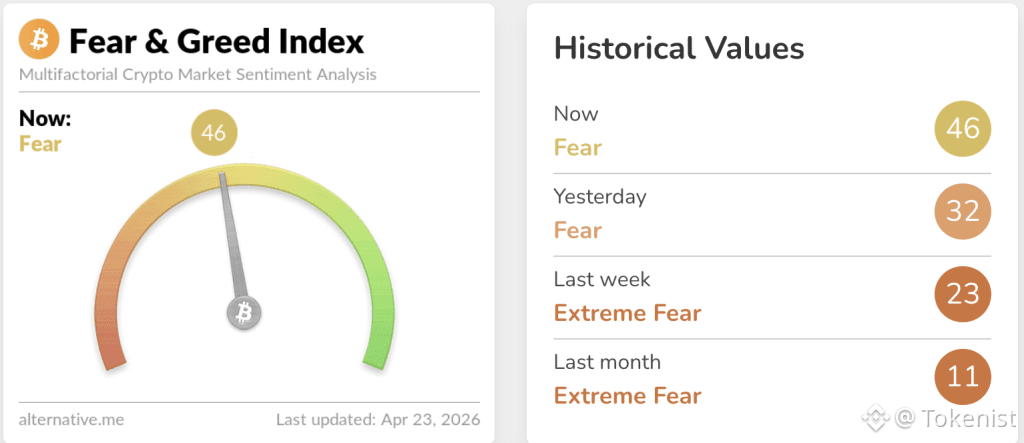 The move to a 3-month high of 46/100 (Fear) comes as exchange-held Bitcoin supply has declined, a signal analysts associate with long-term holder accumulation rather than distribution.
