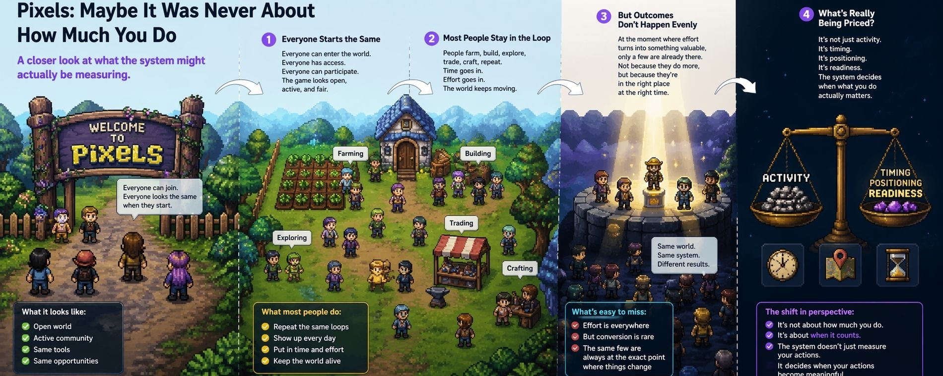 Because on the surface, Pixels looks like a game built around participation. Everyone is doing something. Farming, building, trading, exploring, checking in. So naturally, you start by thinking that participation is what the system values most.