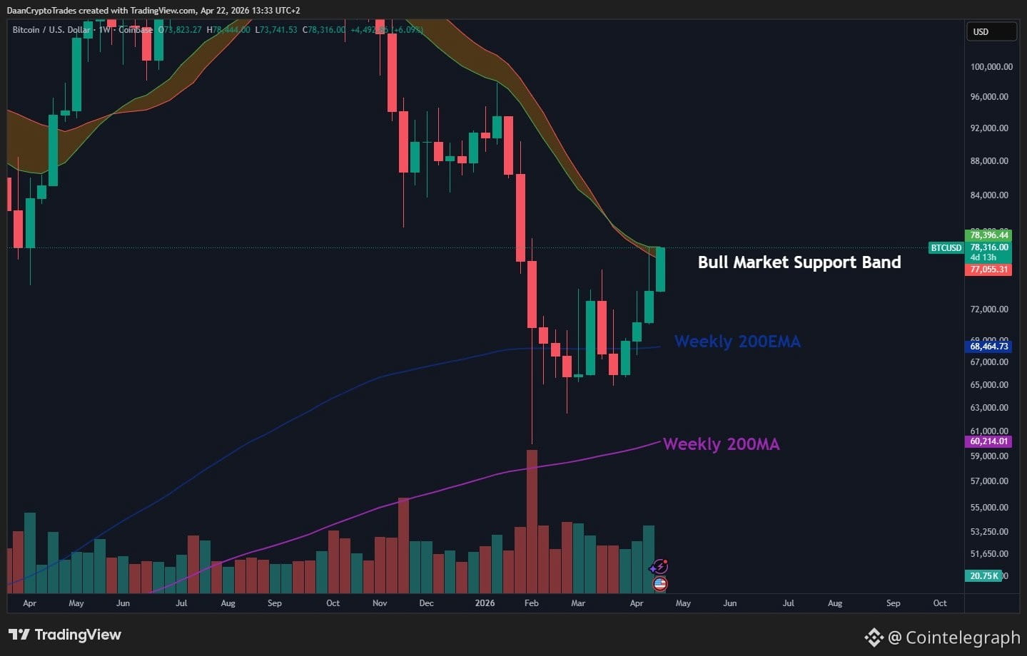“$BTC Attempting to break back above the bull market support band,” trader Daan Crypto Trades confirmed.