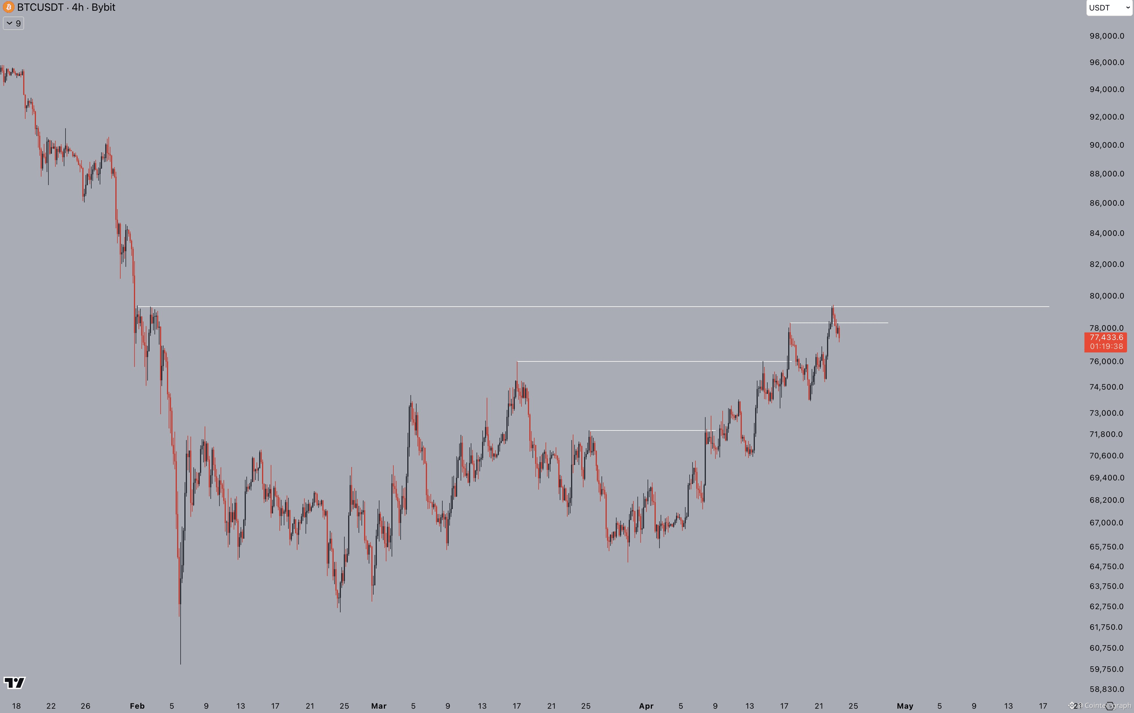 The pair hit $79,500 the day prior, marking its highest levels since the last day of January as the $80,000 mark remained narrowly out of reach.