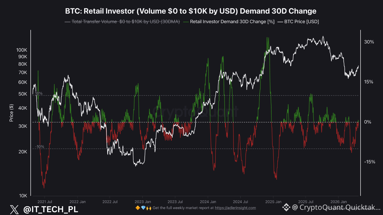 - Recovery to -1.4% as price hit 78K - retail activated within weeks of the bounce