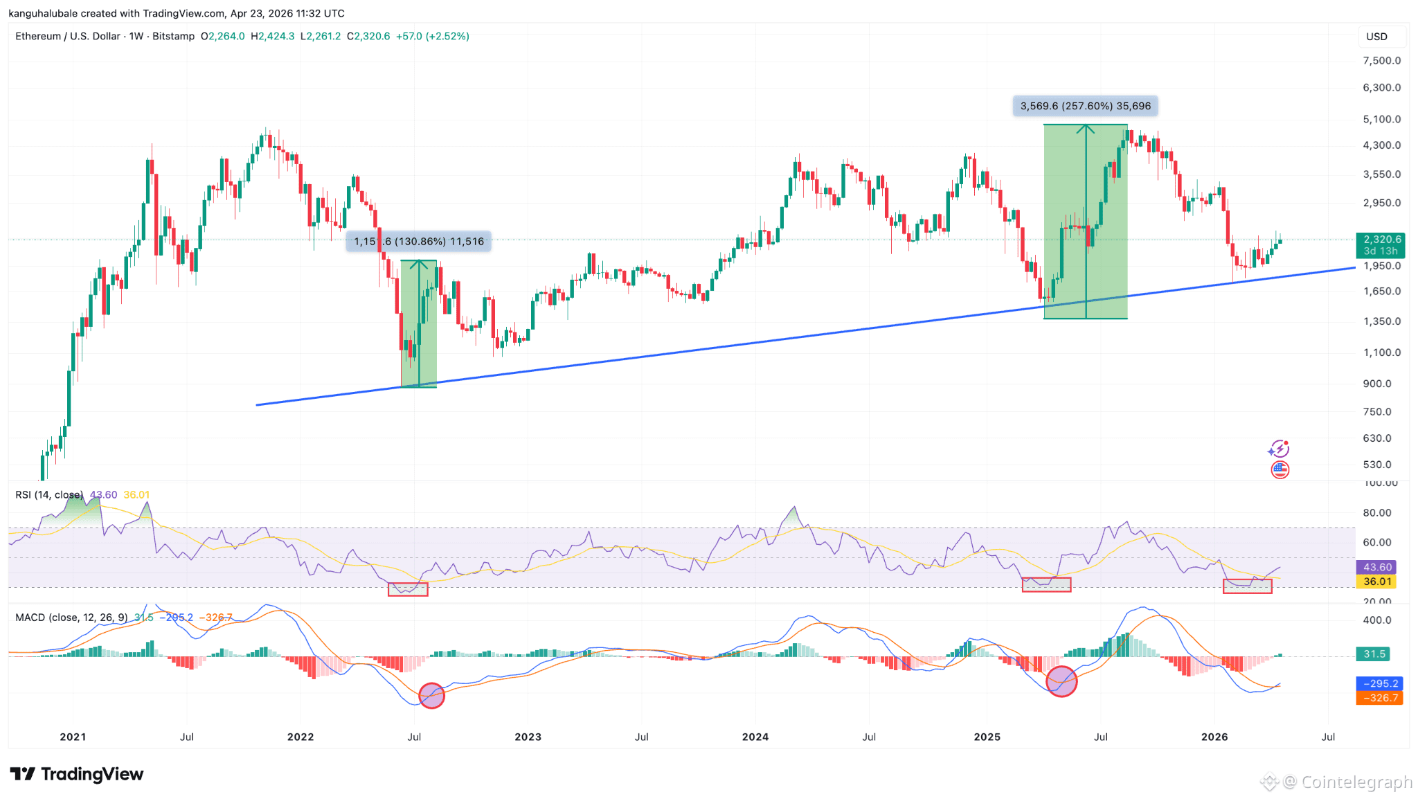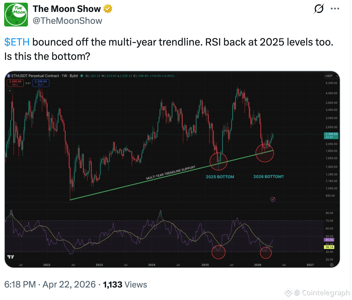 Ether is currently bouncing off a multi-year trend line that has historically marked macro ETH price bottoms. Previous instances in April 2025 and mid-2022 resulted in 260% and 130% ETH price rallies, respectively.