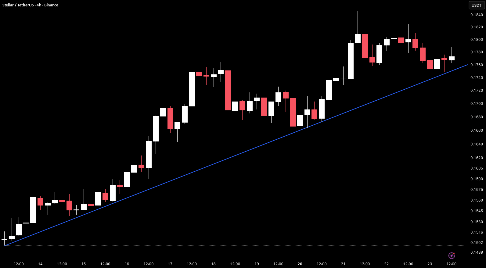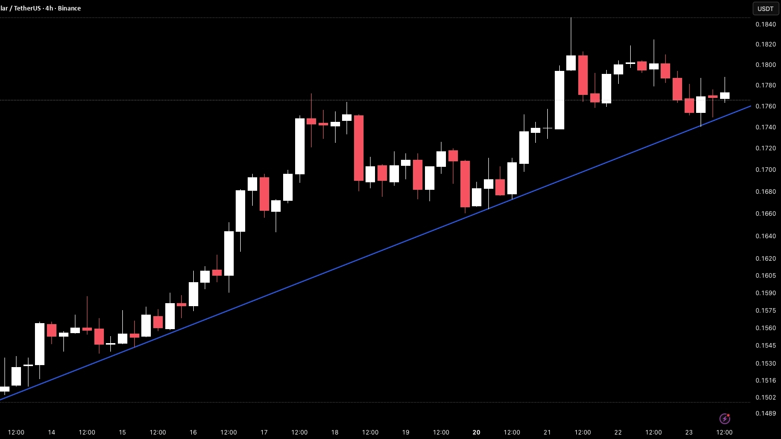 XLM on the 4H timeframe is currently trading around 0.1776 after a strong rally from the rising trendline that pushed price all the way to 0.1840 before pulling back.