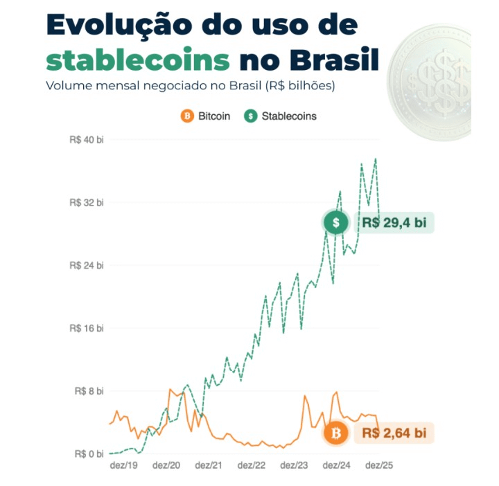 Hoje, muita dessa entrada acontece via stablecoins. Elas já dominam o mercado cripto brasileiro e funcionam como porta de entrada. A pessoa entra nelas primeiro e, depois, acaba migrando parte do dinheiro pro Bitcoin.