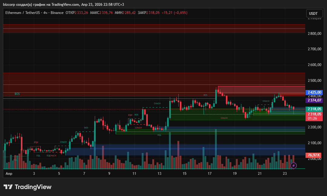 Сравнивая дневной график (D1) и актуальный 4-часовой (4H) график ETH/USDT от конца дня 23 апреля, мы видим, что цена реализовала локальный медвежий сценарий и сейчас плотно «сидит» на ключевой поддержке.