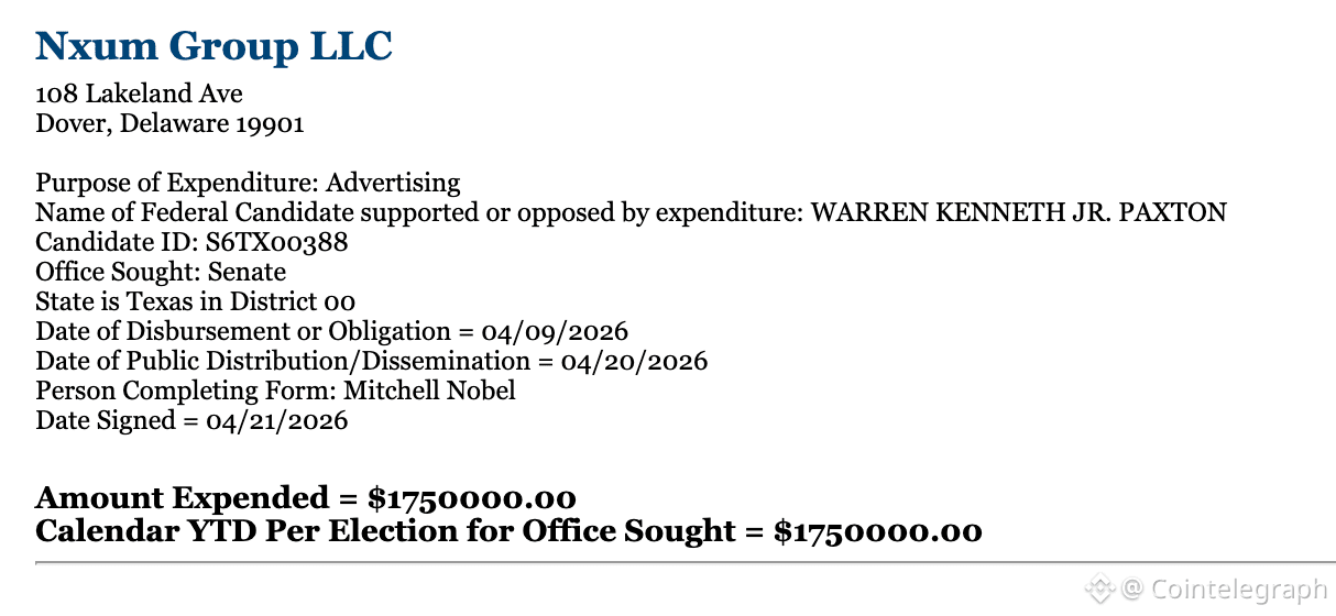 In addition to Paxton, the PAC reported spending $350,000 on advertising for Mike Collins in Georgia’s Senate race, $350,000 on Barry Moore in Alabama’s Senate race, and $250,000 and $350,000 on Blake Miguez and Julia Letlow, respectively, for House and Senate races in Louisiana. All expenditures went through the Nxum Group, a marketing company co-founded by former White House crypto adviser and Tether US CEO Bo Hines.
