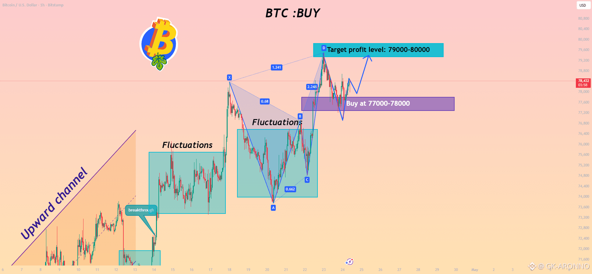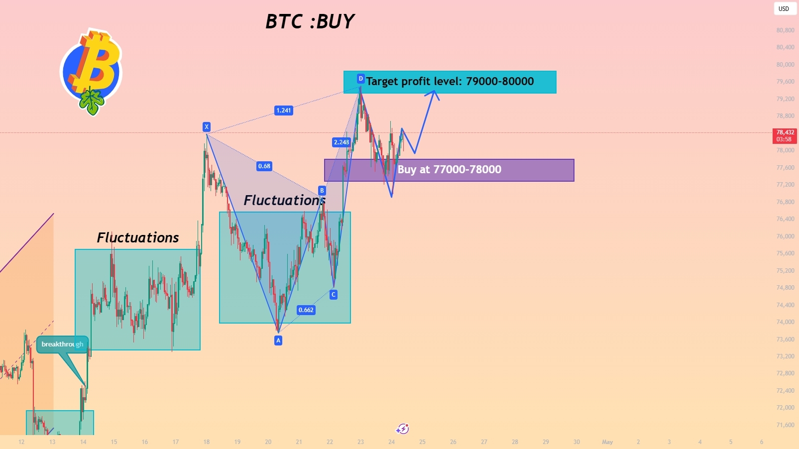 Second support (strong): $77,500-$77,600 (4-hour moving average, short-term bullish support level; a break below this level would indicate a weakening trend)