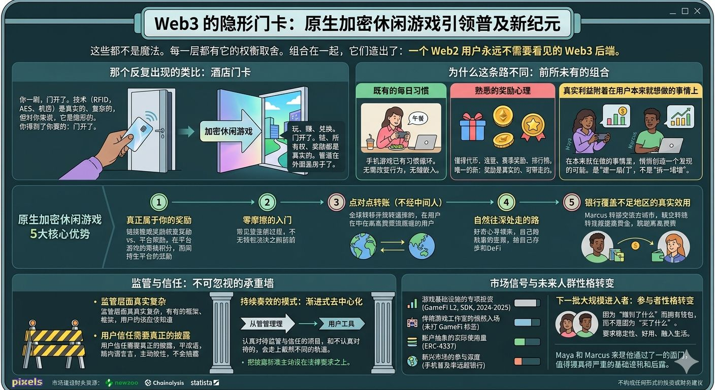 加密休闲游戏,正在为 Web3 制造那张门卡。链是真实的,所有权是真实的,奖励是真实的、可以带走、属于你——这和 Fortnite 里的 V-Bucks 有根本的区别。但从用户那一侧:你玩,你赚,你兑换。门开了。门后面的一切都是基础设施——而好的基础设施,在你不需要它的时候,永远保持隐形。
