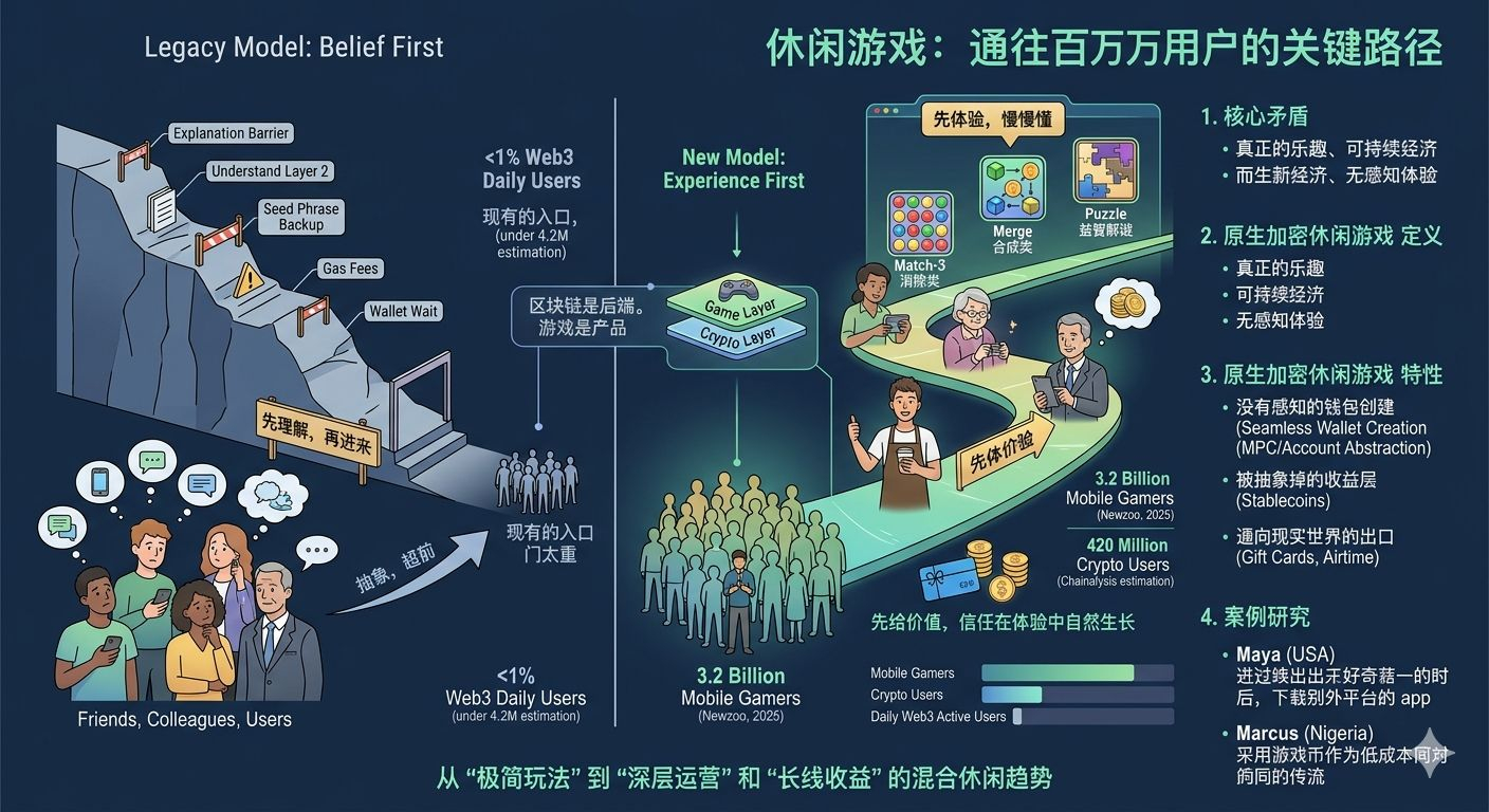 这组数字放在一起,差距很难当没看见。全球有32亿人在以某种频率玩手机游戏。接触过加密钱包的人,不到4.2亿。每天还在实际使用的,又只是这4.2亿里的一小部分。