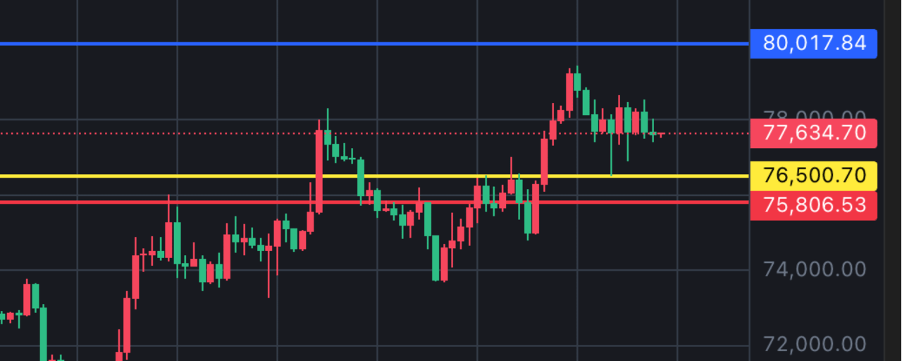 又到了横盘/震荡的戏码部分,就在刚才,$BTC 稳稳回踩到了 $77,500 区间。