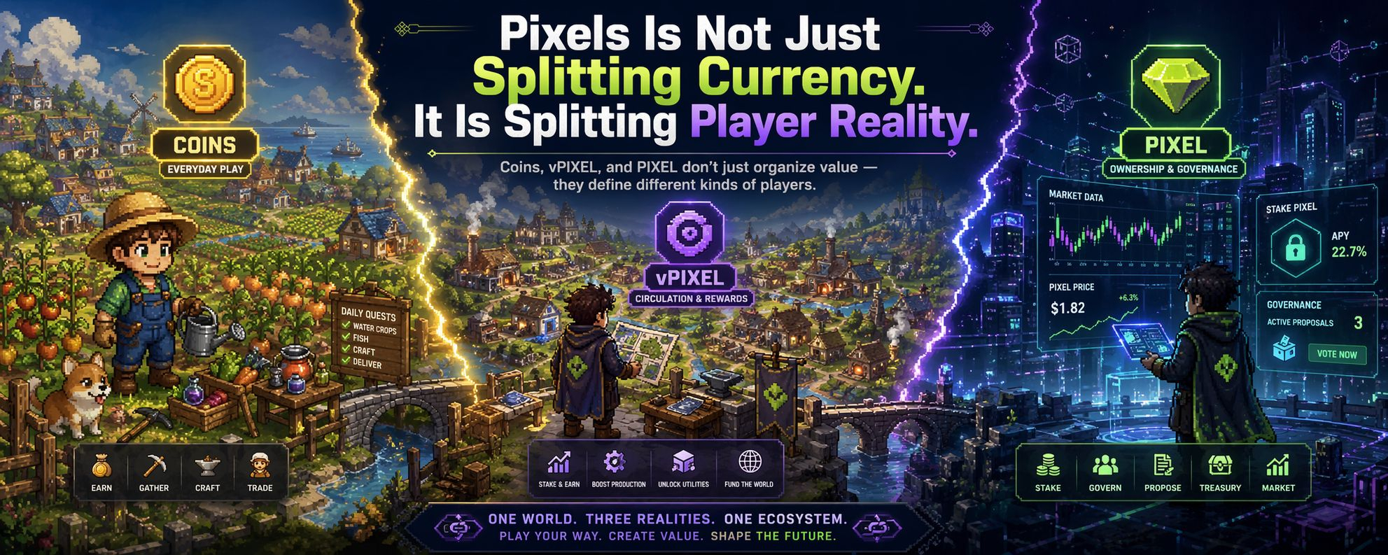 That part is easy to notice. Anyone can point at Coins, vPIXEL, and PIXEL and say the system is layered. The more useful question is quieter: what kind of player is each currency really speaking to?