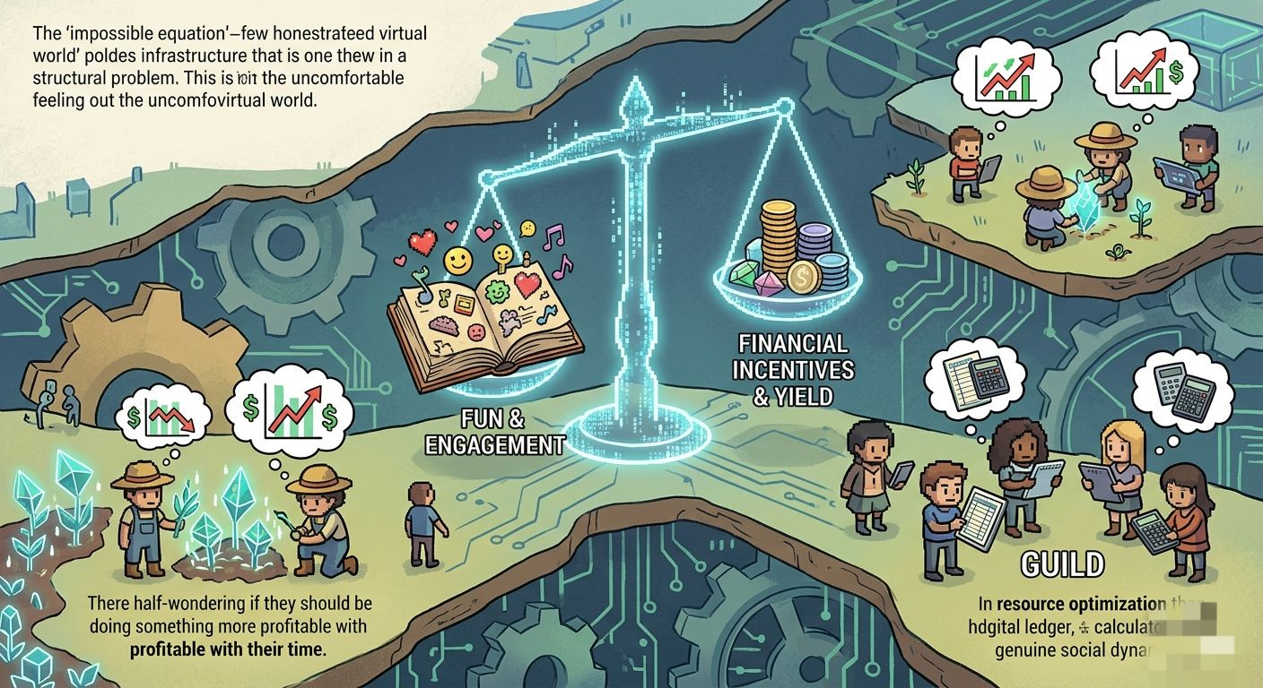 What bothers me is the "social" part. Social games work when people play together because they want to, not because there's yield to be extracted from cooperation. But how do you build genuine social dynamics when everyone's half wondering if they should be doing something more profitable with their time? When guilds form not around friendship but around resource optimization?