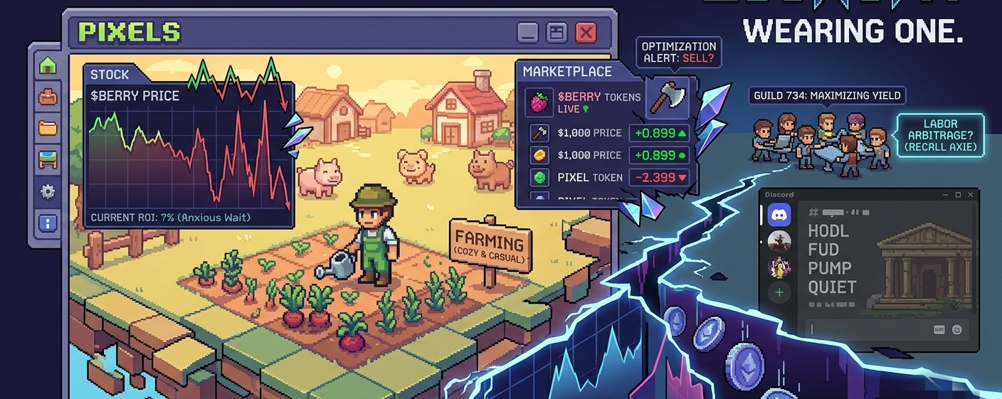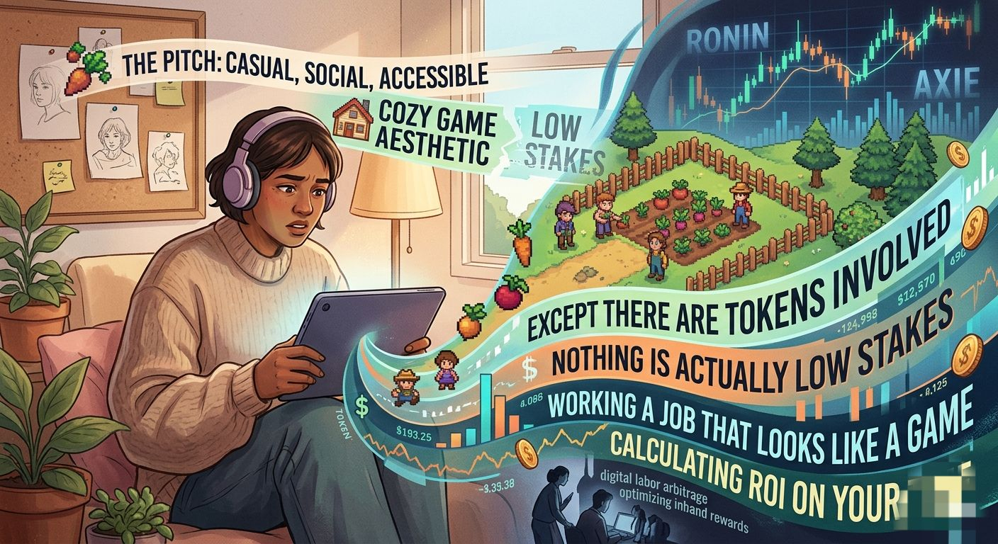 The pitch is always some version of casual, social, accessible. A game your non crypto friends might actually play. Pixels leans into farming and creation, the cozy game aesthetic that's worked for Stardew Valley and Animal Crossing. Comfort gaming. Low stakes. Except there are tokens involved, and the moment there are tokens involved, nothing is actually low stakes anymore.