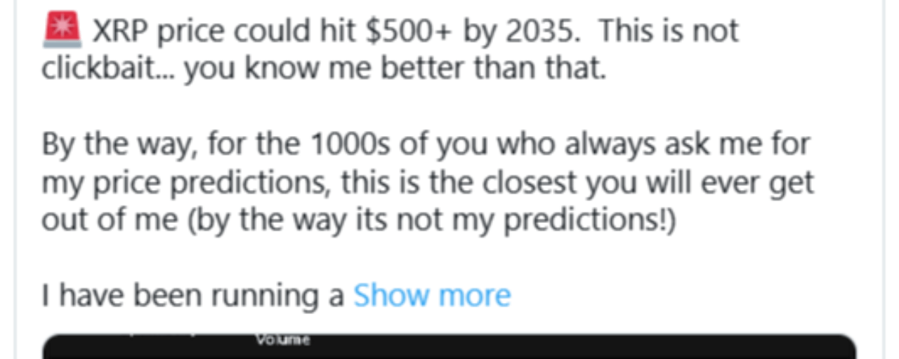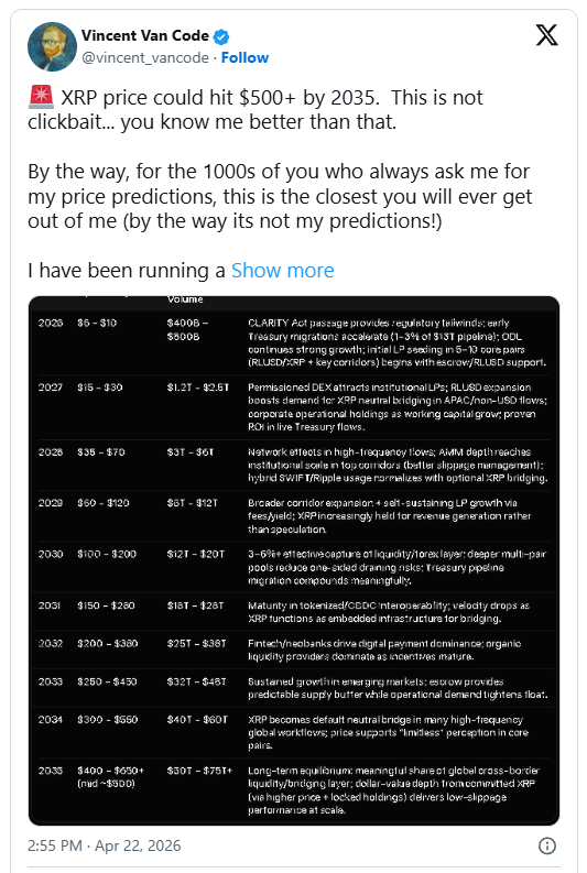 $XRP Software engineer Vincent Van Code has published a detailed post on X presenting a long-term analytical outlook for XRP, supported by an extensive artificial intelligence-driven study. He states that the projection, which suggests XRP could exceed $500 by 2035, is not intended as a personal prediction but rather the output of a structured modeling process.