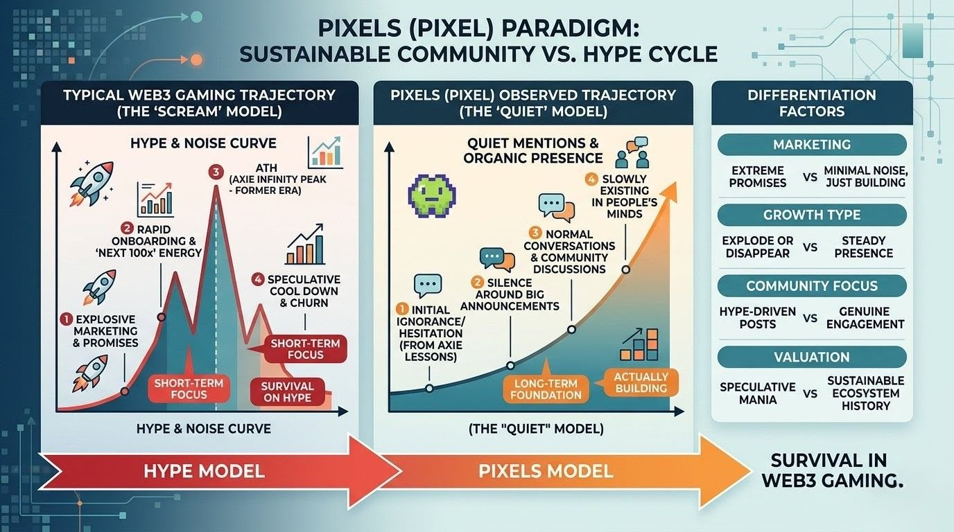 It wasn’t announcements or marketing that pulled my attention back. It was the silence around it. Or maybe not silence exactly more like quiet mentions. I started seeing Pixels appear in small community discussions not in those big hype driven posts but in normal conversations. No next 100x energy. Just people actually talking about it.