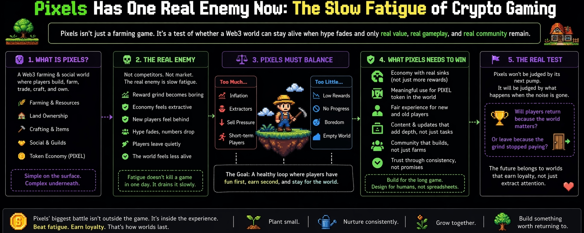What Pixels needs is not more noise. It needs the boring stuff done well. Balance. Clarity. Fair reward pacing. Less unnecessary friction. Better reasons to return. A world that does not feel like it was designed only for people who joined early or people who treat every mechanic like an extraction route.