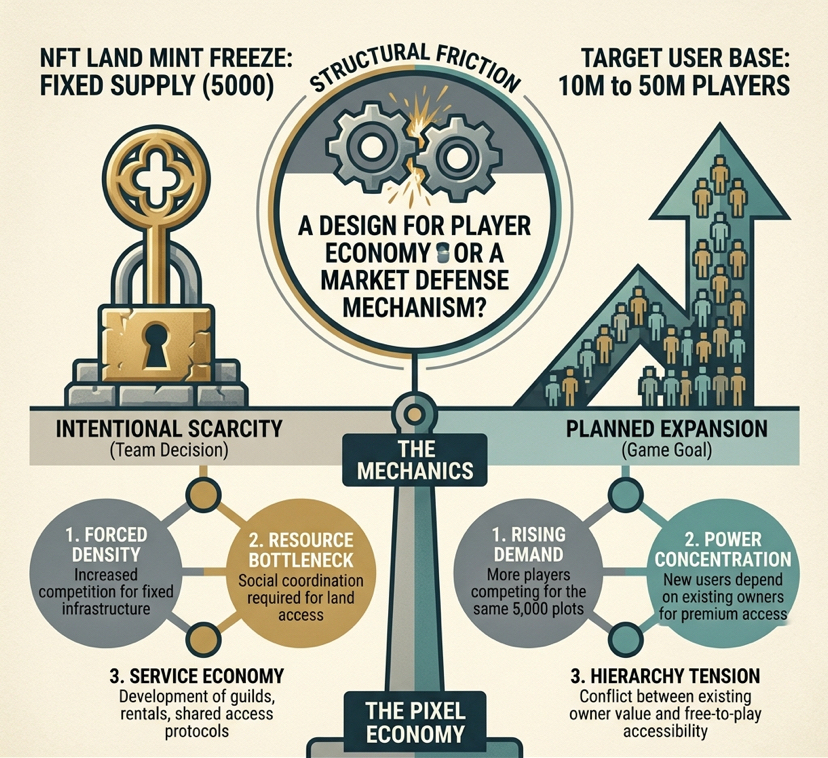 This decision creates an immediate structural tension: the team is committed to a fixed supply of land while simultaneously aiming to scale the player base from ten million to fifty million users. This is not a roadmap delay but a deliberate architectural choice that forces the ecosystem into a state of artificial density.