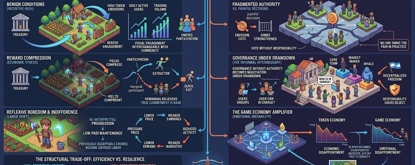 The second pressure point is property rights without enforcement power. Decentralized systems often distribute assets, status, or governance claims broadly, but they cannot compel coordinated sacrifice during downturns. In traditional firms, management can cut budgets, restructure incentives, or absorb losses centrally. In tokenized systems, authority is fragmented precisely where painful decisions become necessary. If emissions should be reduced, some constituency loses income. If sinks should be strengthened, another group bears cost. If progression should be slowed to preserve scarcity, active users feel punished. Everyone can vote in theory, but no one owns the pain in practice.