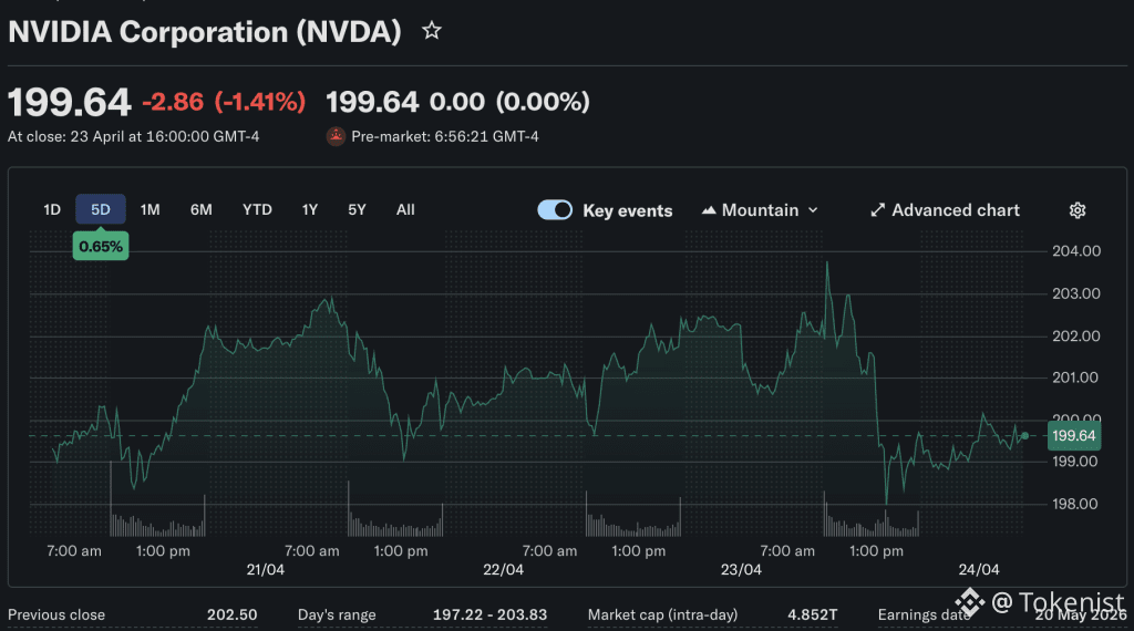 NVIDIA (NVDA) was trading at approximately $199 as of late April 2026, up roughly +7% year-to-date, while the S&P 500 has declined approximately -7% over the same period. The 52-week range spans $160 to $210, with the stock sitting in the lower half of that band amid persistent overhang from successive export control announcements.