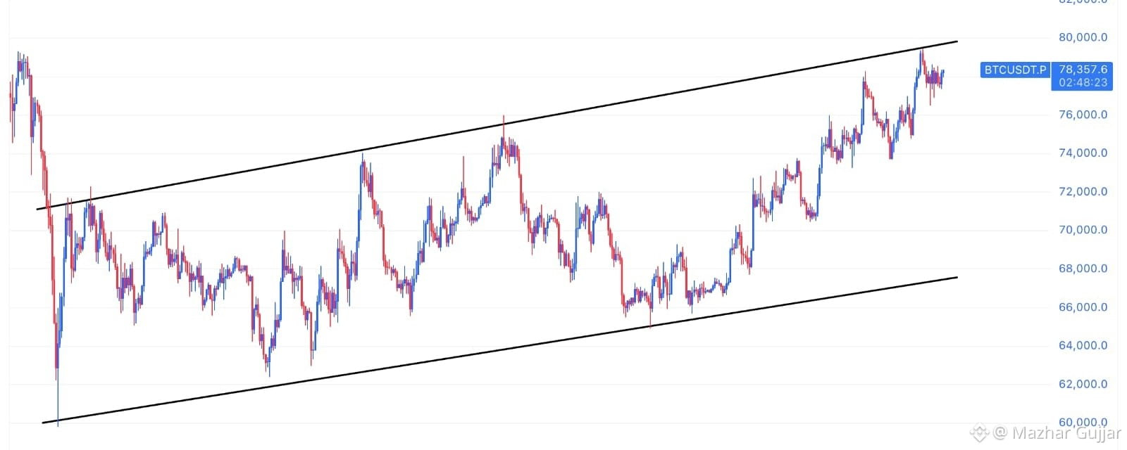 Bitcoin is still respecting the ascending channel it's been riding since February, and right now price is pushing into the upper boundary around the 79.5k–80k zone. Every dip into channel support has been bought aggressively, and this latest bounce from 74k confirms buyers are still in control for now.