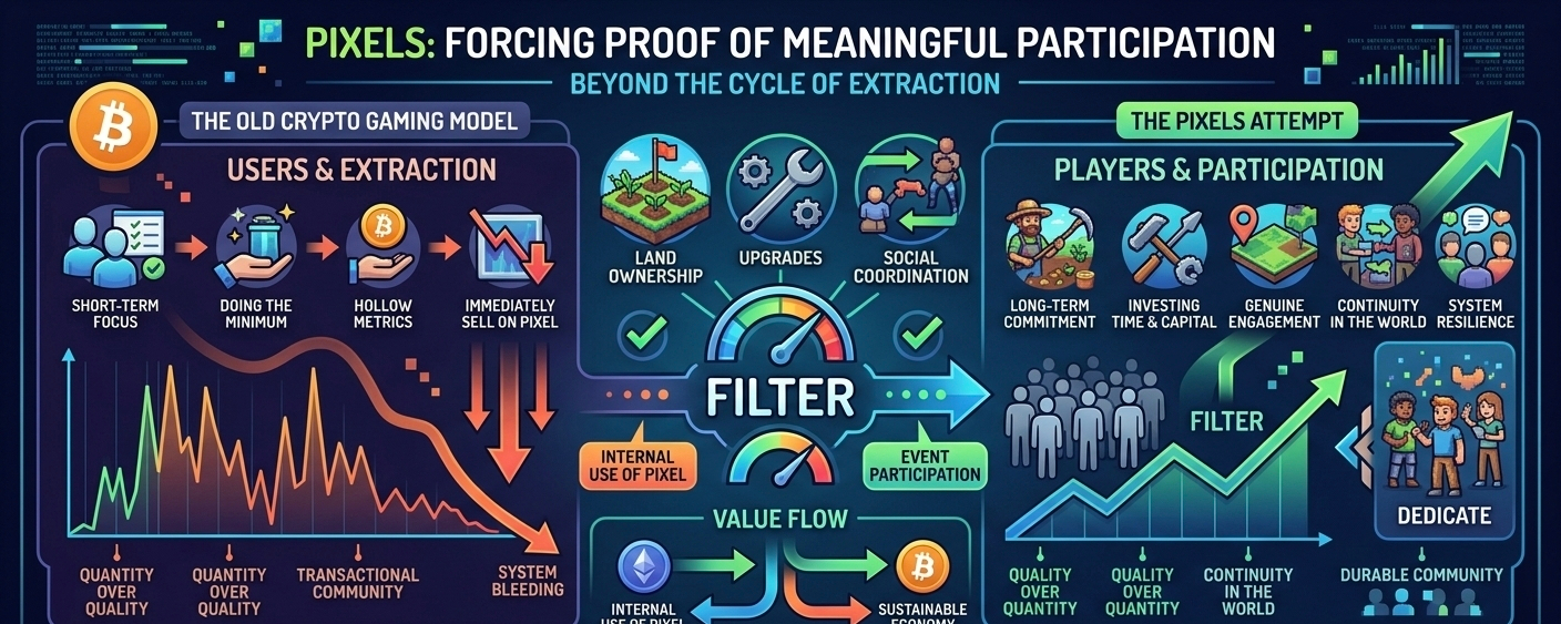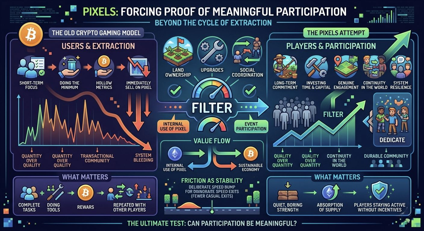 Pixels doesn’t need to prove that crypto games can attract users. That part has already been solved many times. What it’s being forced to prove—whether intentionally or not—is something much harder: can a crypto game make participation actually mean something? Not just showing up. Not just clicking. Not just extracting. But contributing in a way the system can recognize, reward, and sustain. If that filter holds, the economy has room to breathe. If it doesn’t, then Pixels becomes another familiar outcome—where the game was real enough, but the incentives were louder.