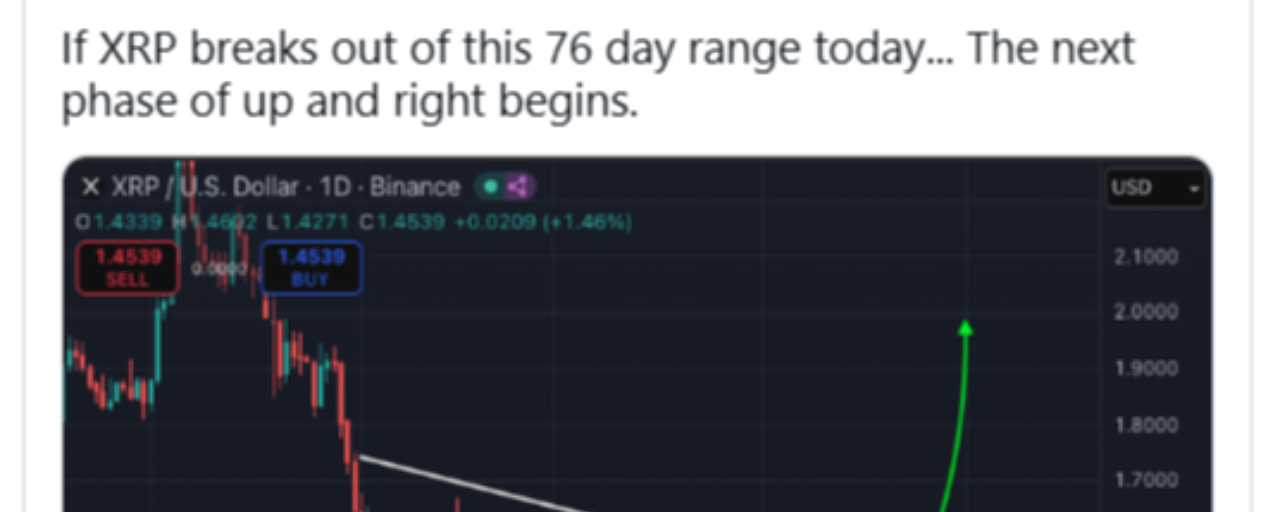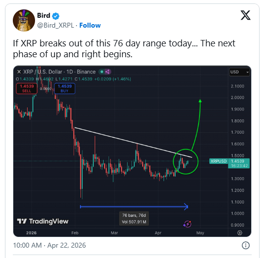 Developer and crypto analyst Bird (@Bird_XRPL) highlighted this moment, stating, “If XRP breaks out of this 76-day range today… The next phase of up and right begins.”