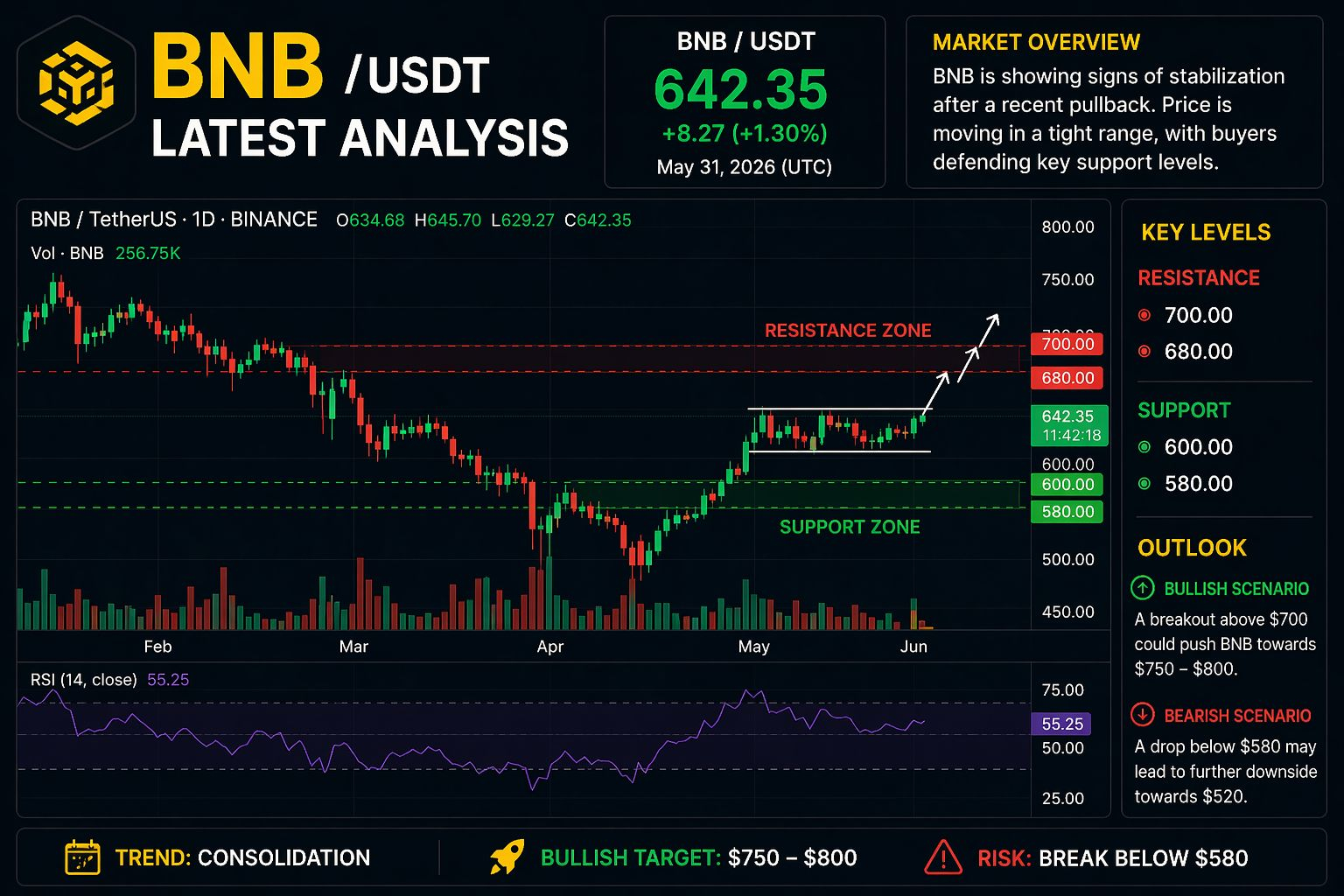 Current trend: $BNB is trading around the $600–$650 range, showing stabilization after a recent correction. Price action suggests consolidation with buyers defending key support levels. �