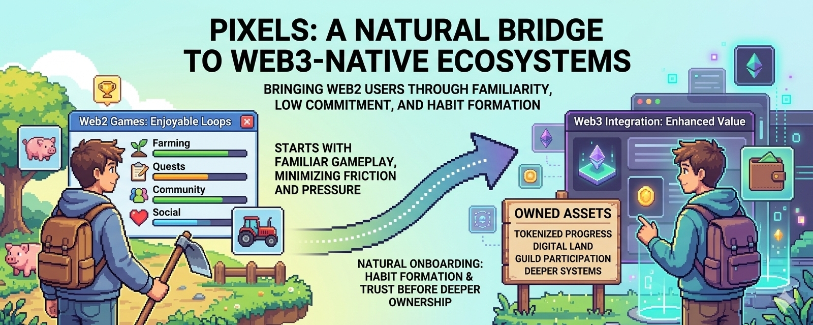 At the end of the day, I think Pixels works because it understands something very basic but very important: people do not adopt new ecosystems because they are told to. They adopt them because something about the experience feels enjoyable enough, safe enough, and meaningful enough to keep exploring. Pixels brings Web2 users into Web3 by making the first step feel normal. It does not ask them to change who they are. It simply gives them a game they can understand, a world they can return to, and a path that slowly reveals deeper value.