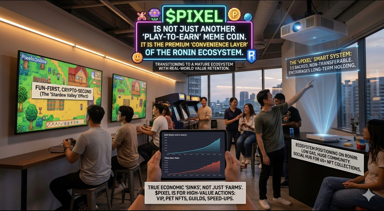 $PIXEL is the "convenience layer" of Ronin, moving beyond the 2021 GameFi crash. It leads with a "Stardew Valley" fun-first model that hooks Web2 gamers, ensuring real retention over speculation. Unlike inflationary "farm" tokens, $PIXEL is a utility sink used for VIP perks, Pet minting, and Guilds—with constant burns reducing supply. Backed by the vPIXEL staking system and Ronin’s massive infrastructure, it’s a social hub for 65+ NFT collections. Focus on DAUs, not just price. 🎮🚀!