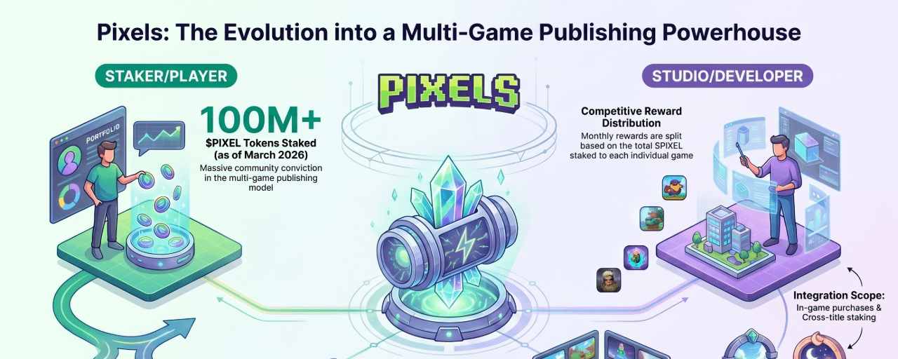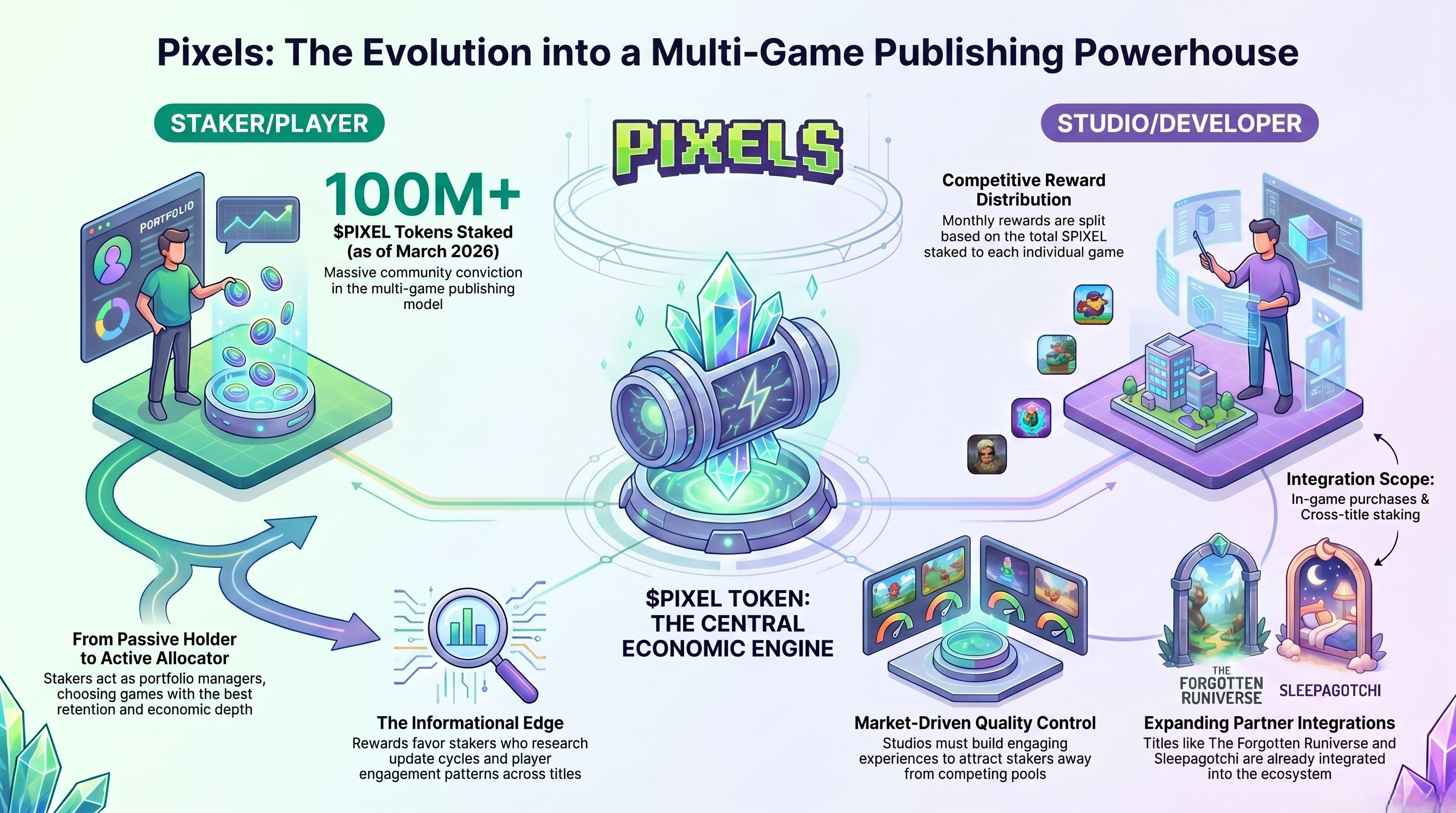 because the architecture they are describing is real. PIXEL staking rewards are split based on total PIXEL staked to each individual game, encouraging studios to build high-quality experiences capable of attracting stakers away from competing pools. as of March 2026, Pixels has integrated partner games including The Forgotten Runiverse and Sleepagotchi, with PIXEL usable for in-game purchases and staking across titles. over 100 million PIXEL tokens are staked across the ecosystem, a figure that reflects genuine conviction from a player base that has understood what the multi-game model is actually building toward.