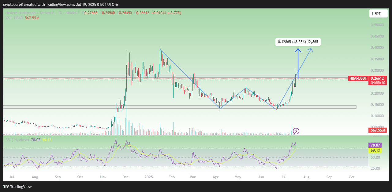 Biểu đồ này cho thấy một thiết lập tăng giá cho HBARUSDT. Giá đã bật mạnh từ hỗ trợ và đang hình thành mẫu cốc và tay cầm. RSI trên 78, cho thấy động lực mua mạnh. Khối lượng đã tăng, hỗ trợ cho sự tăng giá. Các mũi tên xanh cho thấy một sự tăng giá khả thi 48%. Nếu giá phá vỡ kháng cự quanh $0.30, nó có thể tăng cao hơn. Tổng thể, biểu đồ cho thấy người mua đang kiểm soát, và thị trường có khả năng tiếp tục di chuyển lên trên với động lực và sự tự tin mạnh mẽ.