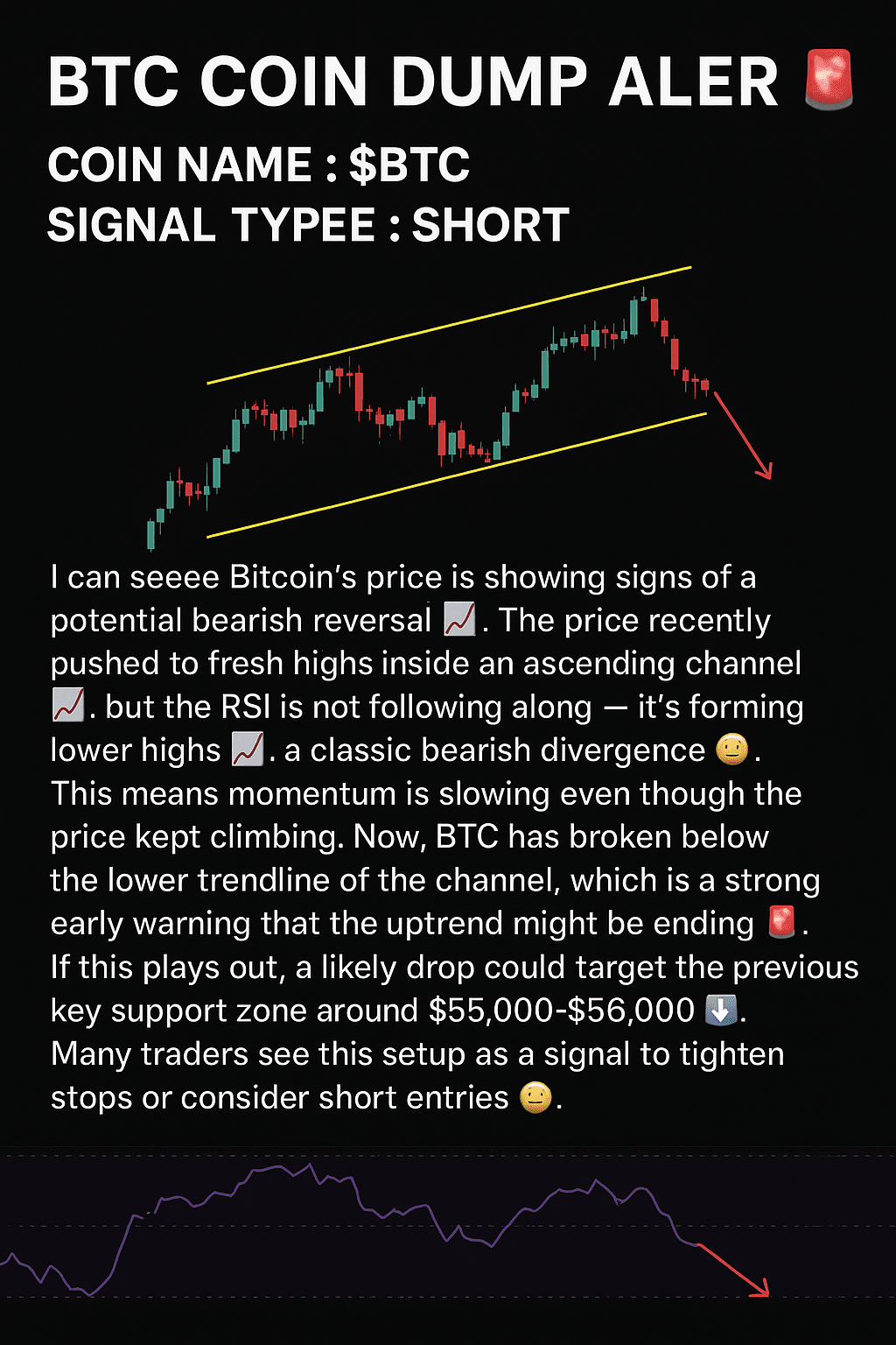 Tôi có thể thấy giá Bitcoin đang cho thấy dấu hiệu của một sự đảo chiều giảm tiềm năng 📉. Giá gần đây đã tăng lên mức cao mới trong một kênh đi lên 📈, nhưng chỉ số RSI không theo kịp — nó đang tạo ra các đỉnh thấp hơn 📉, một sự phân kỳ giảm giá cổ điển 😬. Điều này có nghĩa là động lượng đang chậm lại mặc dù giá vẫn tiếp tục tăng. Bây giờ, $BTC đã phá vỡ dưới đường xu hướng thấp hơn của kênh, đây là một cảnh báo sớm mạnh mẽ rằng xu hướng tăng có thể đang kết thúc 🚨. Nếu điều này xảy ra, một sự sụt giảm có thể nhắm đến vùng hỗ trợ chính trước đó khoảng $55,000-$56,000 ⬇️. Nhiều nhà giao dịch xem thiết lập này như một tín hiệu để thắt chặt các điểm dừng hoặc xem xét các lệnh kéo ngắn 😬.$BTC