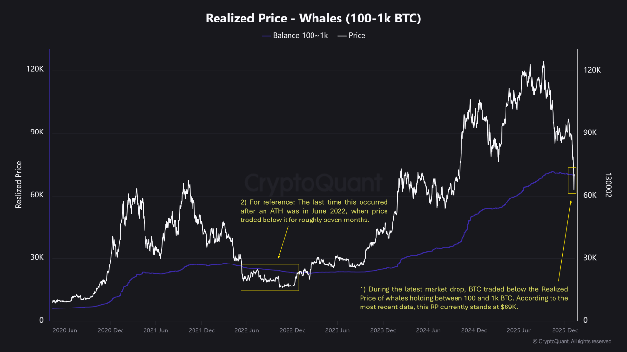 • Trong đợt giảm thị trường gần đây nhất, BTC đã giao dịch dưới Giá Thực tế của những con cá voi nắm giữ từ 100 đến 1k BTC (7-70 triệu đô la ở mức giá hiện tại). Theo dữ liệu gần đây nhất, RP này hiện đang đứng ở mức 69K đô la.