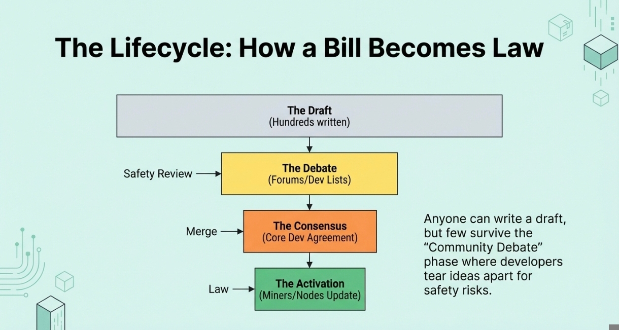 • The Miners (The Security): They run the expensive machines. If they don't like the new rule (BIP), they simply refuse to install the update. The new code dies.