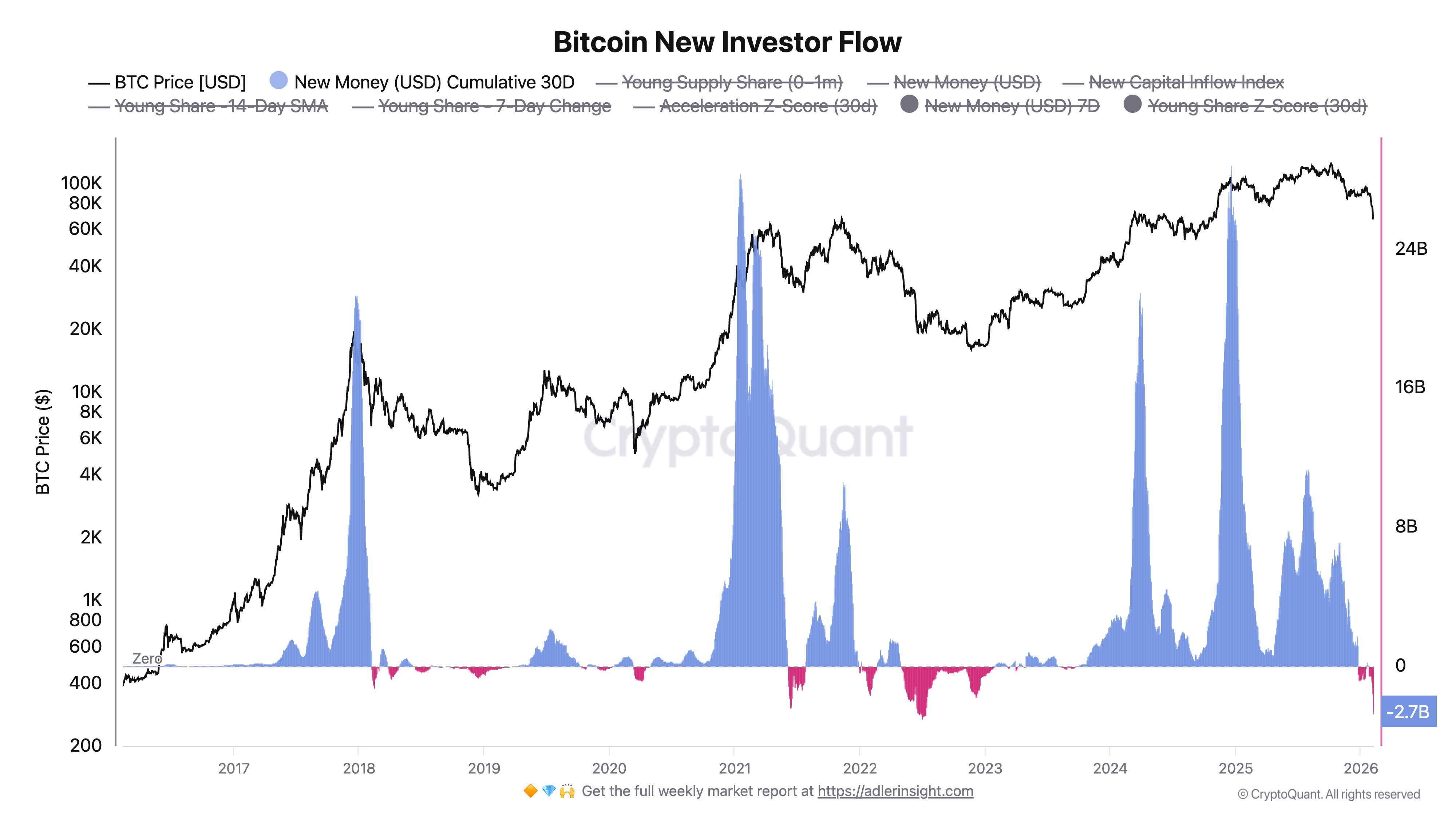 Hiện tại, thị trường đang thiếu máu mới. Dữ liệu ví của các nhà đầu tư ngắn hạn và người mới đang cho thấy mức xả ròng lũy kế lên tới 2.7 tỷ đô, mức cao nhất kể từ năm 2022.