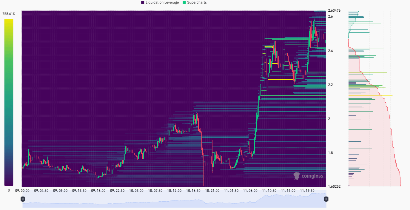 Kháng cự tiếp theo, phía trên, thanh khoản bắt đầu mỏng dần, nhưng có một tường cản tâm lý và kỹ thuật quanh vùng $2.63 - $2.65.