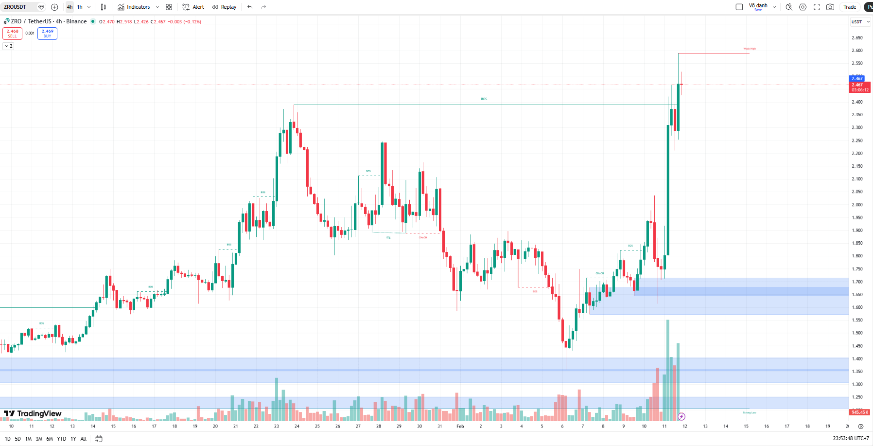 • Trước đó, ZRO bị nén chặt trong biên độ hẹp $1.50 - $1.70. Đây là giai đoạn Gom hàng của Smart Money.