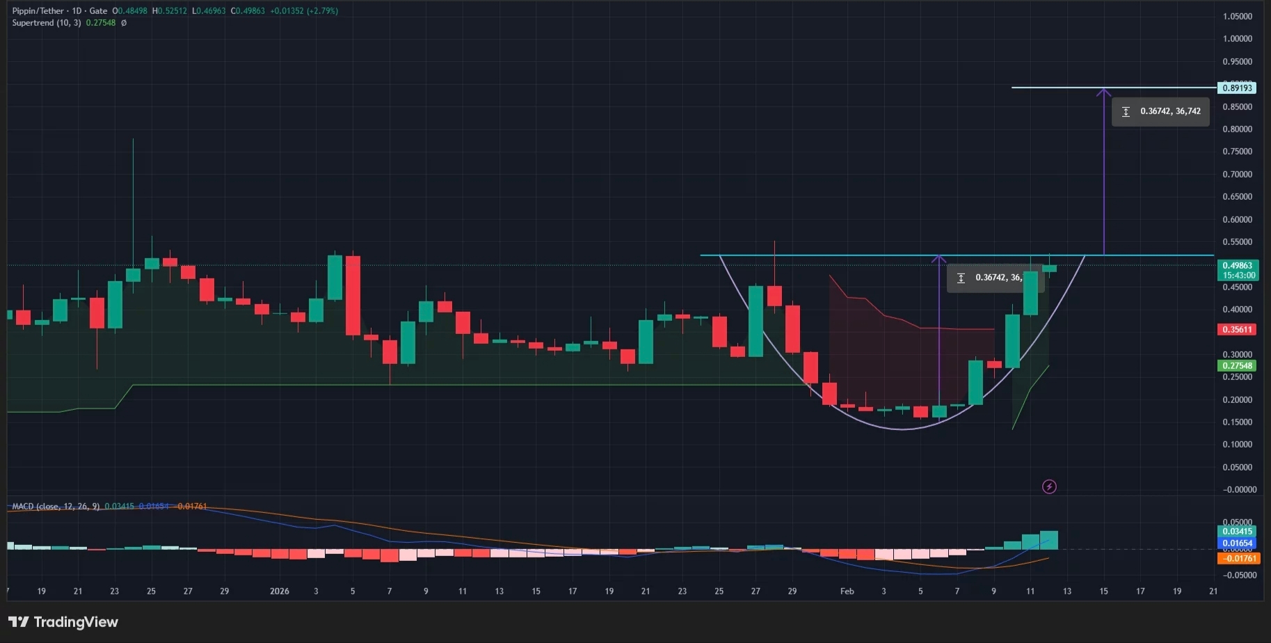 Nếu giữ vững đà này và không bị vĩ mô vả, PIPPIN hoàn toàn có thể chinh phục mốc $0.89. Các chỉ báo Supertrend và MACD đều đang ủng hộ xu hướng tăng.
