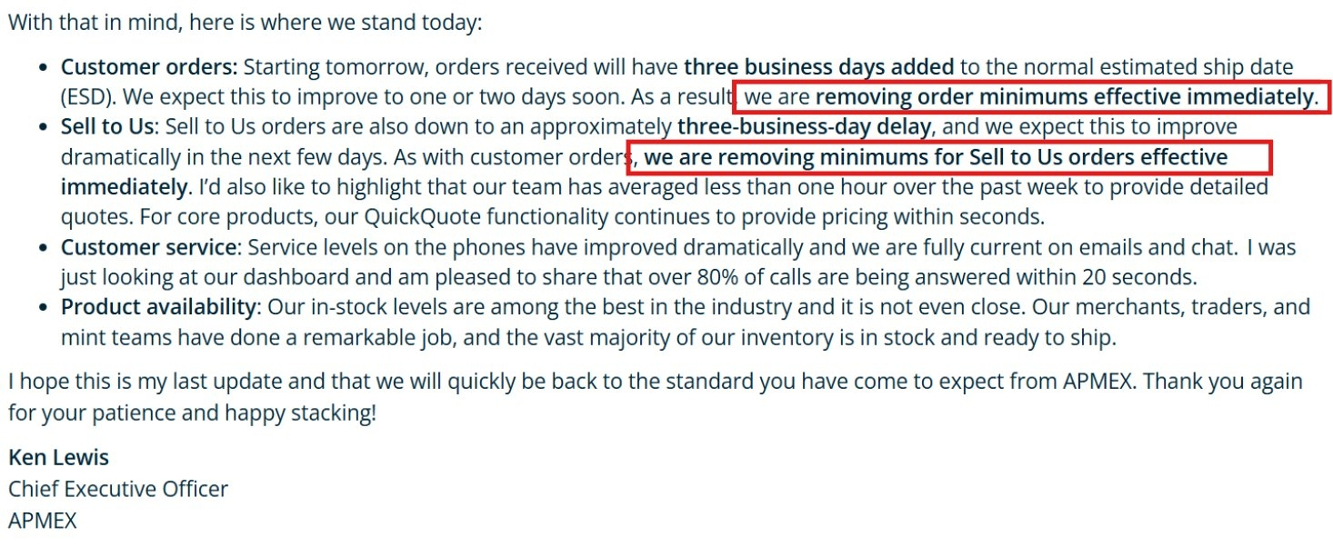 🔸 Giám đốc điều hành Ken Lewis xác nhận việc loại bỏ giá trị đơn hàng tối thiểu cho cả giao dịch mua và bán. Quyết định này được đưa ra khi độ biến động giá bạc đã giảm mạnh trong tuần qua và khối lượng giao dịch từ các nhà đầu tư bán lẻ đã giảm đáng kể.