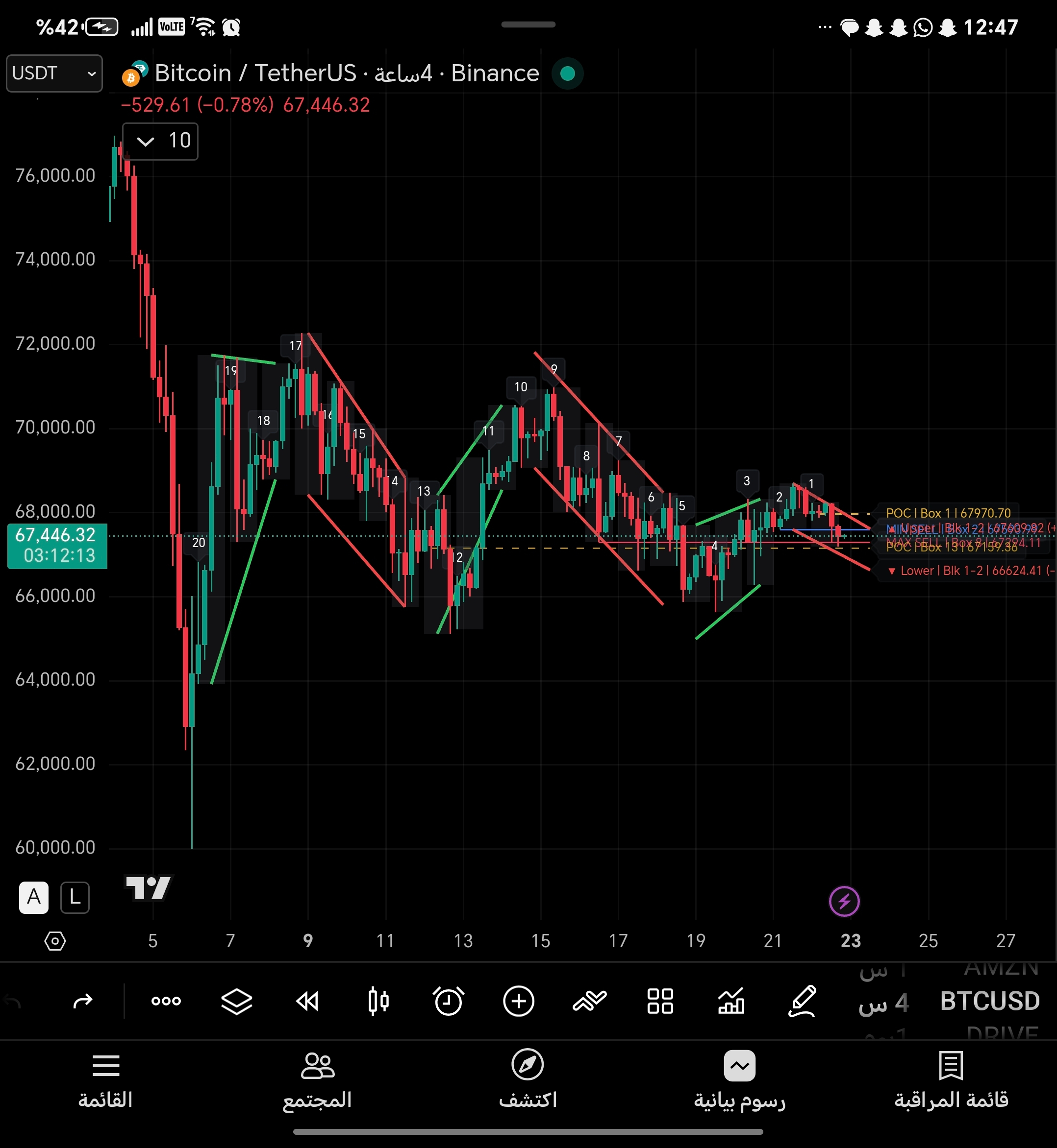 Lưu ý quan trọng: giá đã gần đến giới hạn kênh trên tại 67609.82 (khoảng cách %0.27). Giá gần đến POC 67970.70. Giá gần đến giới hạn kênh dưới tại 66624.41 (khoảng cách %1.19). Giá gần đến mức POC 67159.36, nơi thường chứng kiến khối lượng giao dịch cao. Giá gần đến MIN SELL | Box 2 @ 67593.99 (khoảng cách %0.25). Giá gần đến MAX SELL | Box 8 @ 67294.11 (khoảng cách %0.2).