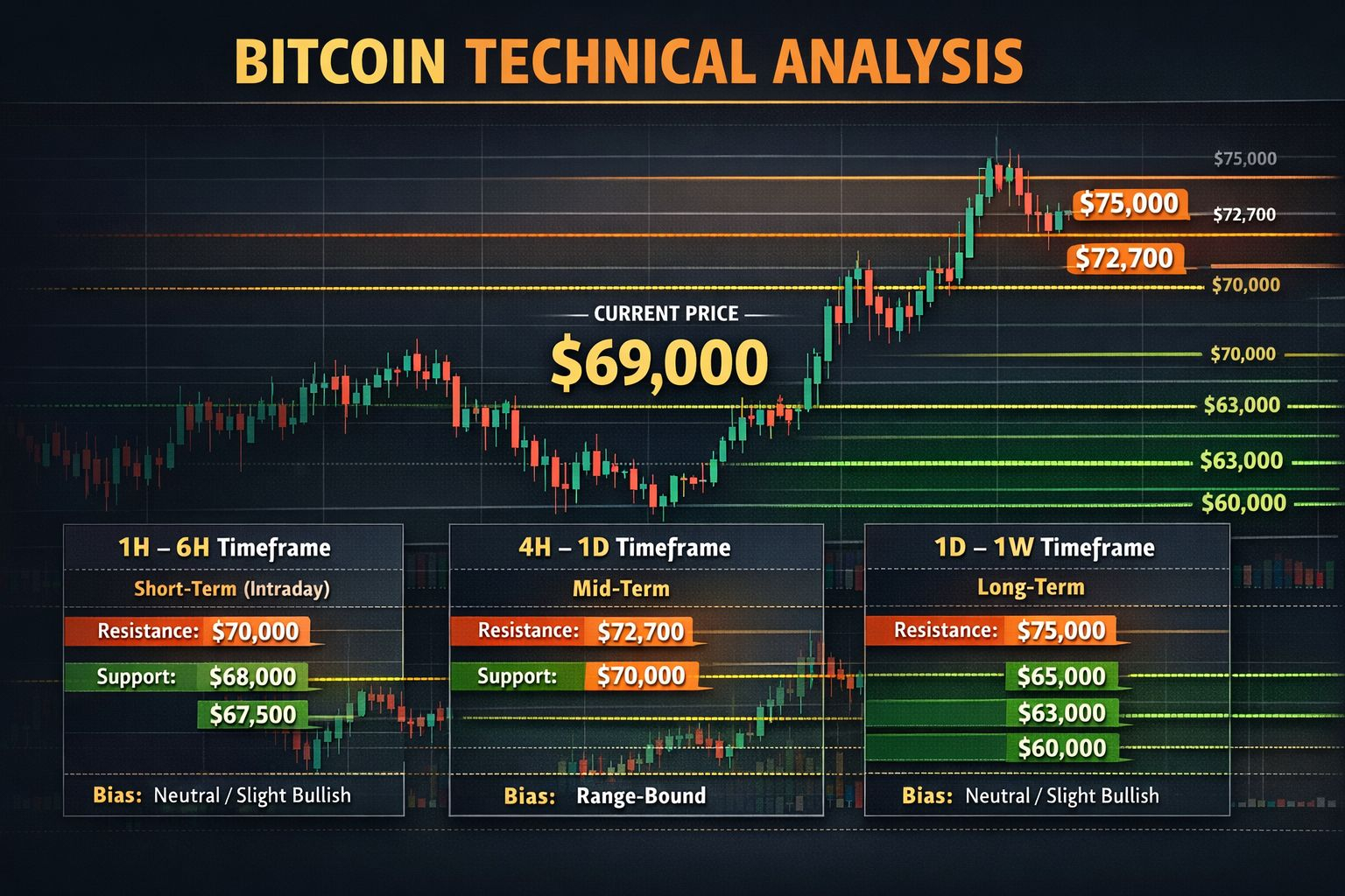 TimeframeSupportResistanceBias1H – 6H$68k$70kNeutral-Slight Bullish4H – Daily$67.5k – $65k$70k – $72.7kNeutral / Range-BoundDaily – Weekly$65k – $60k$72.7k – $75kNeutral-Slight Bullish