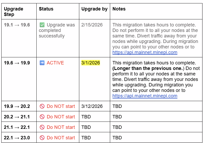 Tất cả các nhà điều hành nút Mainnet được khuyến nghị mạnh mẽ bắt đầu quy trình nâng cấp ngay lập tức để tránh bỏ lỡ thời hạn ngày 1 tháng 3 năm 2026.