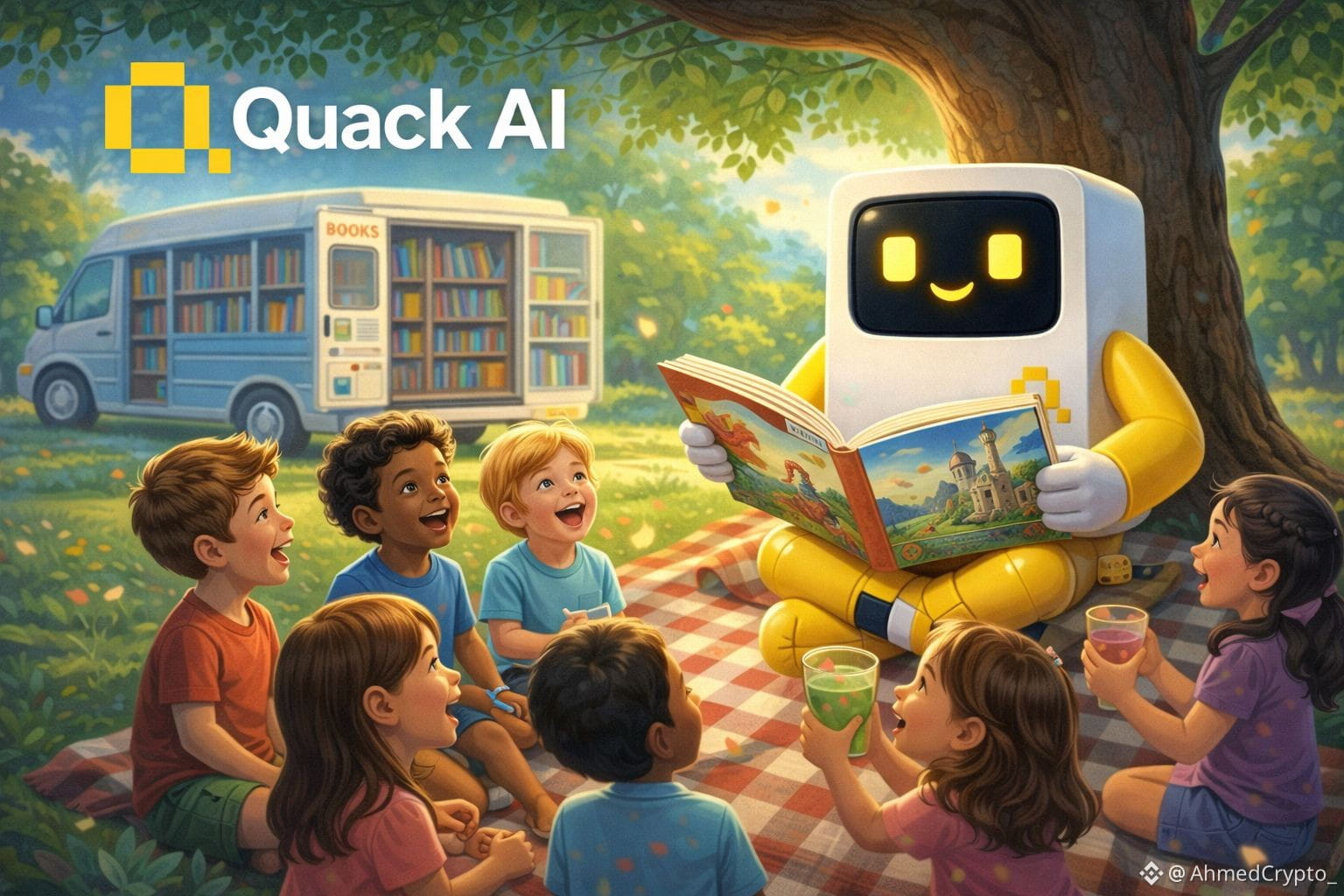 Under a shady park tree, children sit captivated as Quack AI, a friendly robot, reads them a storybook. This heartwarming scene isn't just a display of advanced technology it's a living example of a decentralized future.