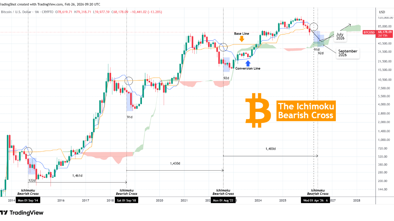 Thời gian giữa hai lần cắt giảm giảm giá Ichimoku cuối cùng đã thấp hơn 30 ngày (1430 ngày so với 1461). Nếu tỷ lệ giảm này giữ vững, thì trong Chu kỳ hiện tại, chúng ta nên thấy Sự cắt giảm giảm giá Ichimoku sau 1400 ngày, tức là vào tháng 6 năm 2026. Dựa trên quỹ đạo hiện tại của các đường, có vẻ như chúng ta sẽ có Sự cắt giảm đó vào tháng 4 năm 2026.