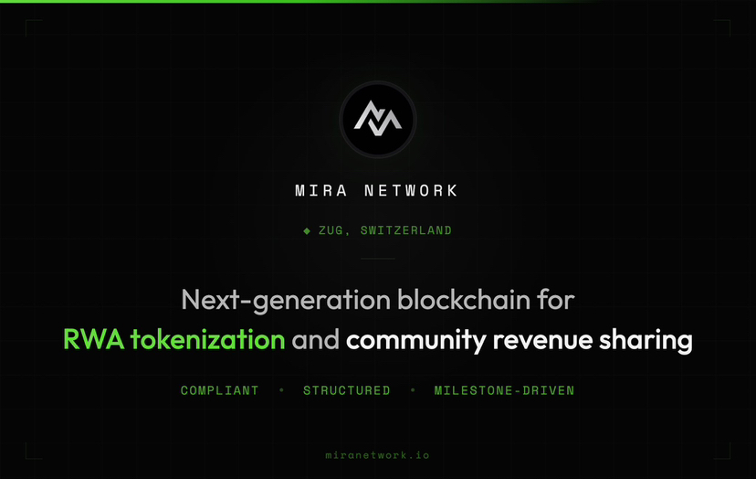 MIRA Network là một công ty Web3 được đăng ký tại Thụy Sĩ, có trụ sở tại Zug, xây dựng một blockchain thế hệ tiếp theo cho việc token hóa RWA và chia sẻ doanh thu cộng đồng.