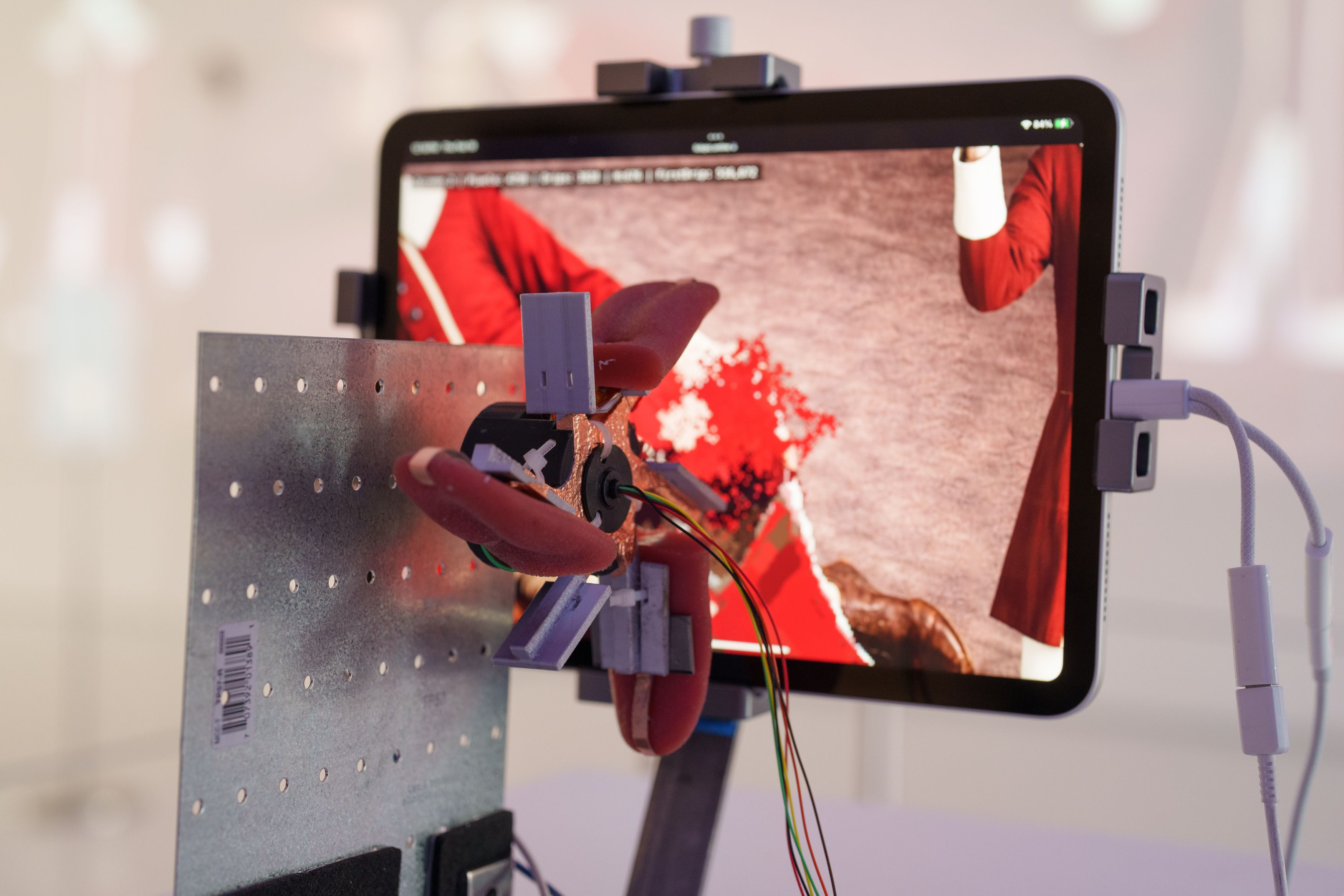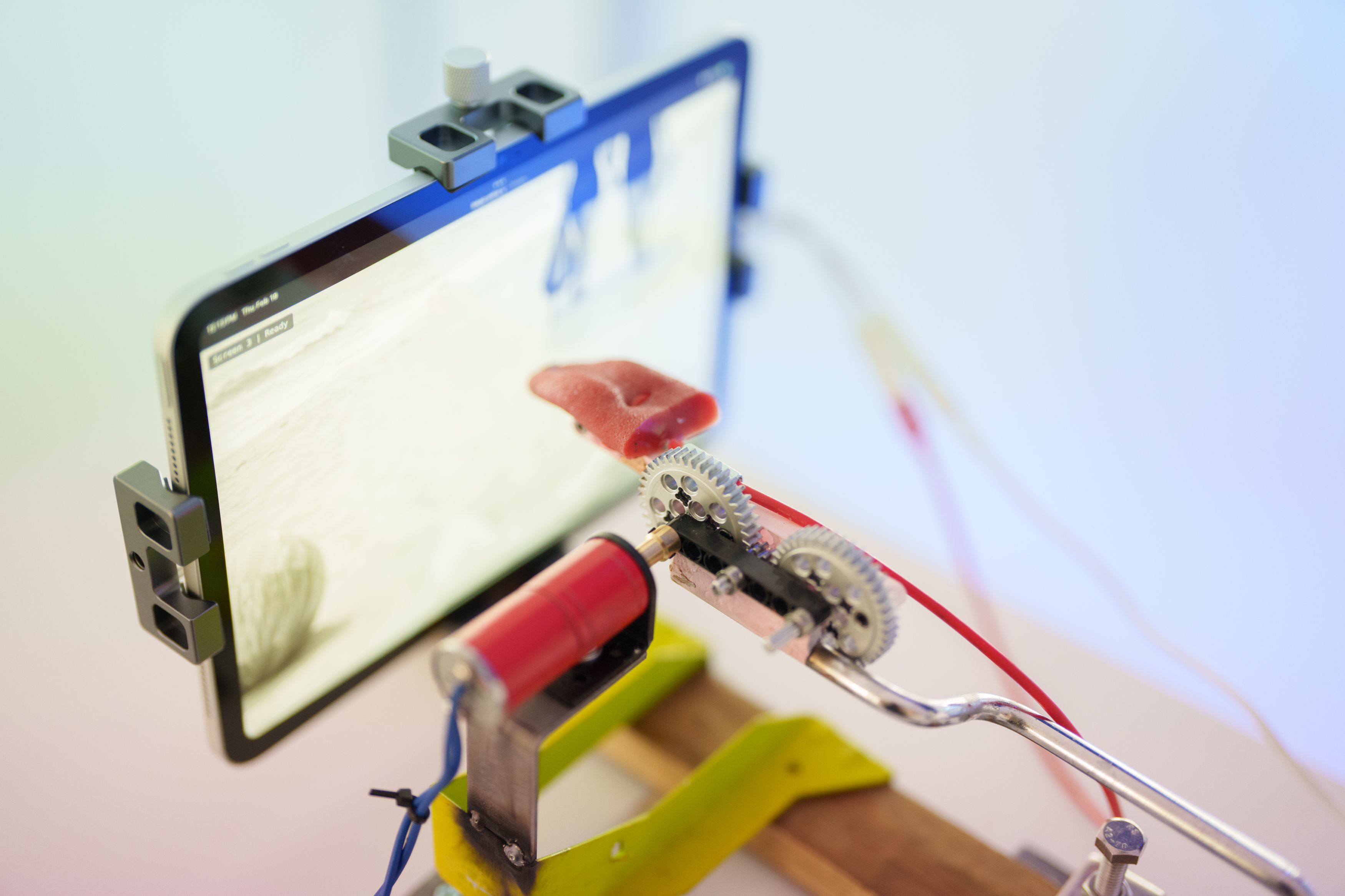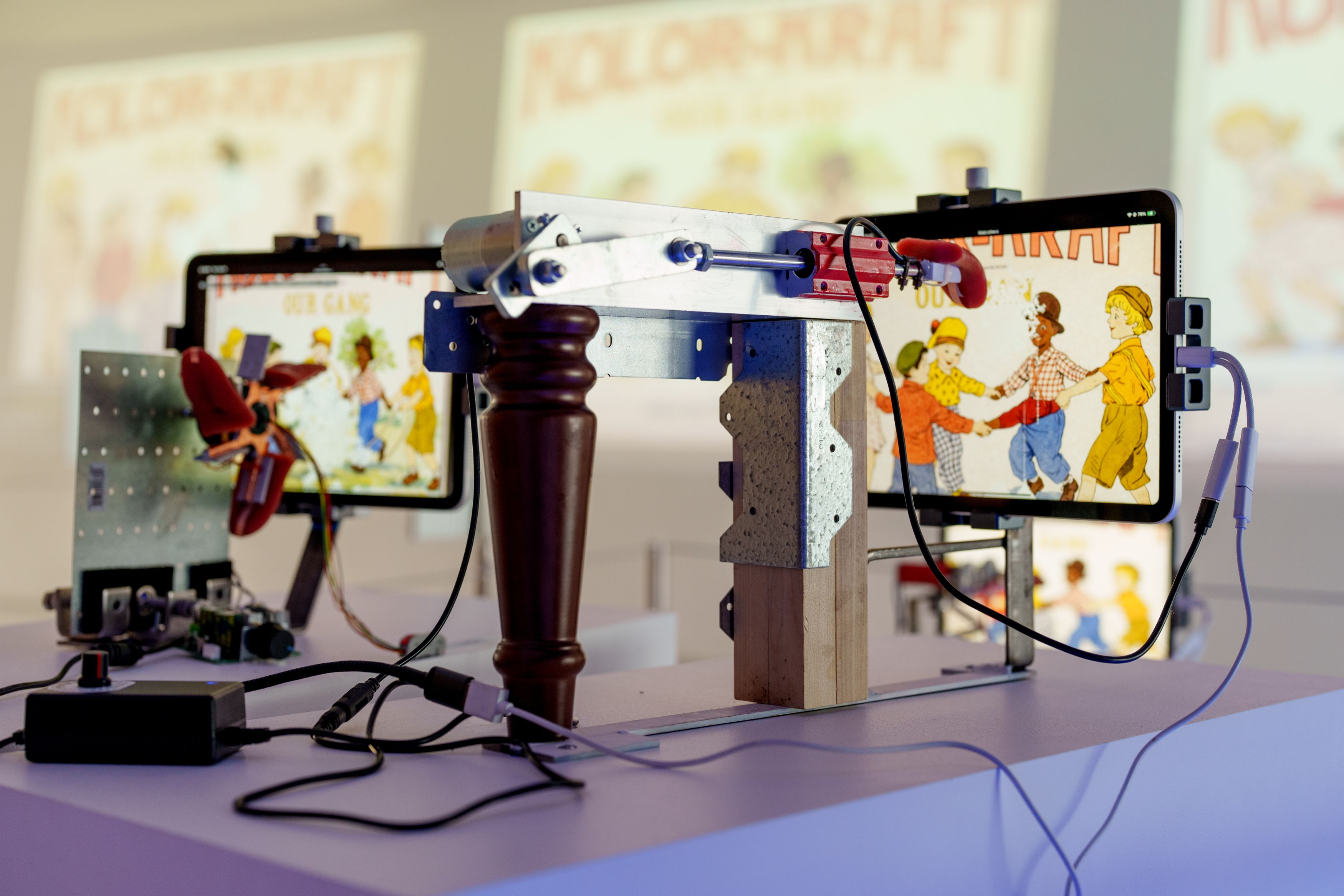 Lướt qua, nó ngay lập tức đáng nhớ: bốn bức tượng lưỡi cơ khí “liếm” các điện thoại và máy tính bảng gắn trên tường, và các màn hình luân phiên qua các hình ảnh từ bộ sưu tập của MoMI.