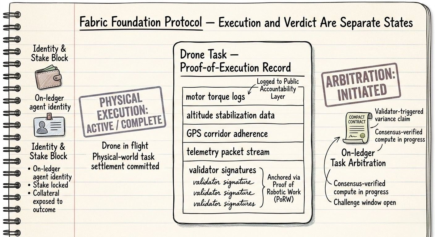 A validator triggers on-ledger task arbitration against the delivery record, an anomaly in weight variance reported through the proof-of-execution records. Not a halt. A dispute. The motion remains valid at the physical layer while the arbitration contract spins up under Fabric governance-linked execution.