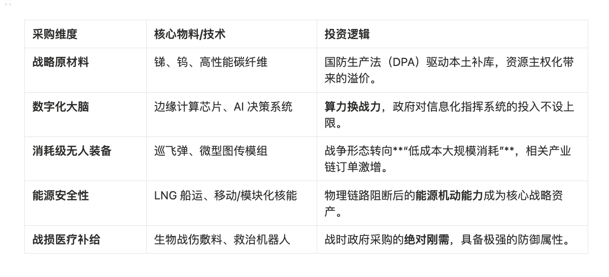 在此背景下,各国政府将系统性加速战略供应链重构、国防工业产能扩张与长效物料储备,这将成为贯穿2026-2030年的长线投资主线,而非单纯依赖地缘脉冲溢价。以下为核心政府采购维度及对应资产逻辑: